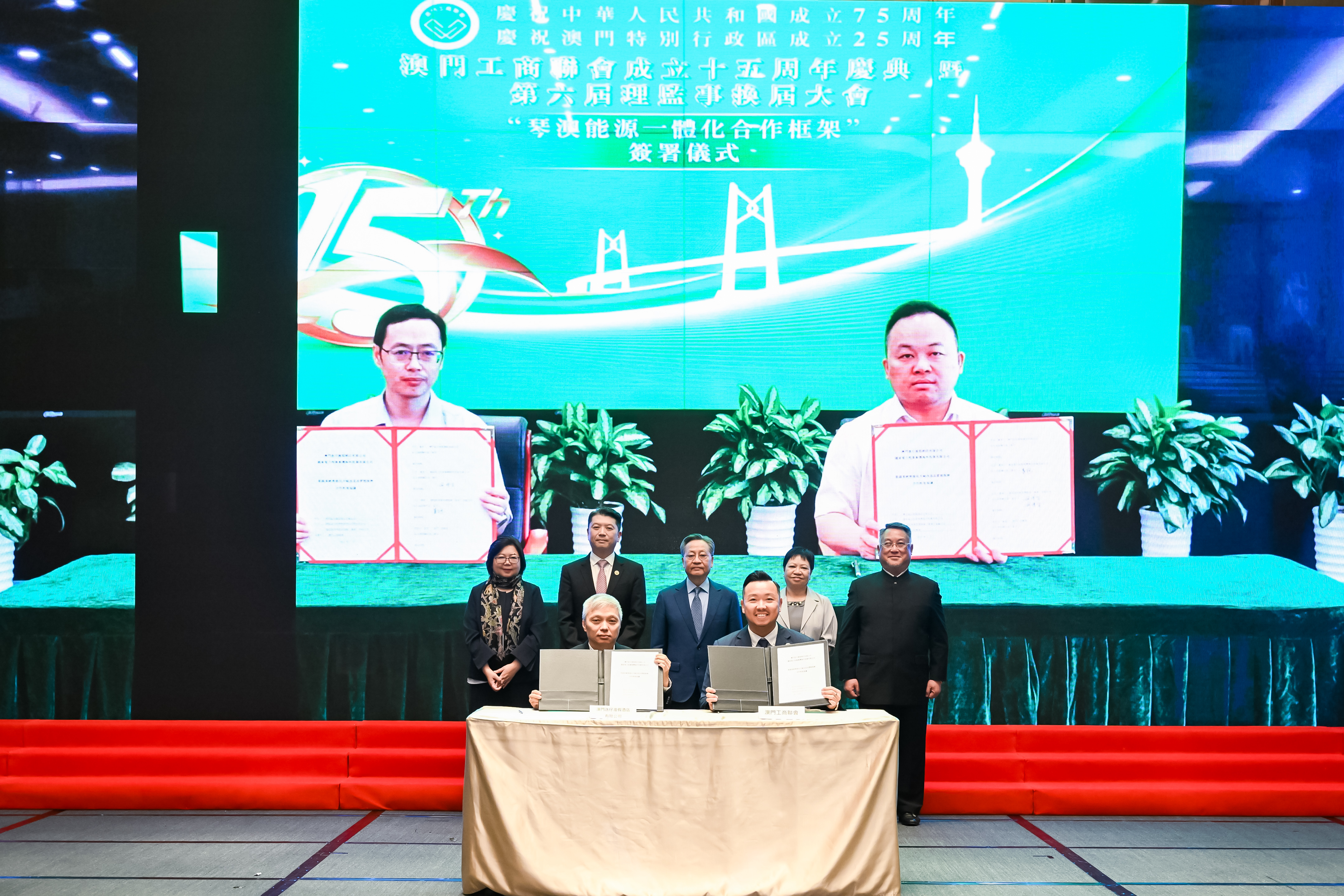 隨後,工商聯藉著十五周年會慶,帶起國家電力投資集團海外投資公司與本澳旅遊企業澳門氹仔渡假酒店有限公司簽署合作框架協議。澳門羅斯福酒店的能源管控系統將全面升級,為澳門建築節能減排工作樹立典範。