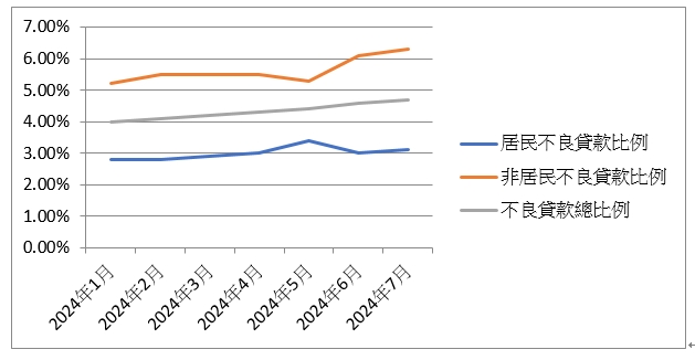 又例如澳人現經逐步入住橫琴深合區澳門新街坊生活、工作、學生就讀等,甚至來澳就讀的大學生也有不少在橫琴新街坊居住,澳門本來人口已不足且流出更使到不少租賃房無奈空置。一環扣一環更導致房地產整體價格下調,出現了資不抵債、負資產狀況,不少中小企倒閉、房屋負資產等等負面的連鎖反應,間接已影響到金融機構的穩定,不排除演變成金融危機的可能性,透過今年銀行壞賬率逐月高升便可窺知(另見圖表),特區政府不能忽視,應予高度重視。