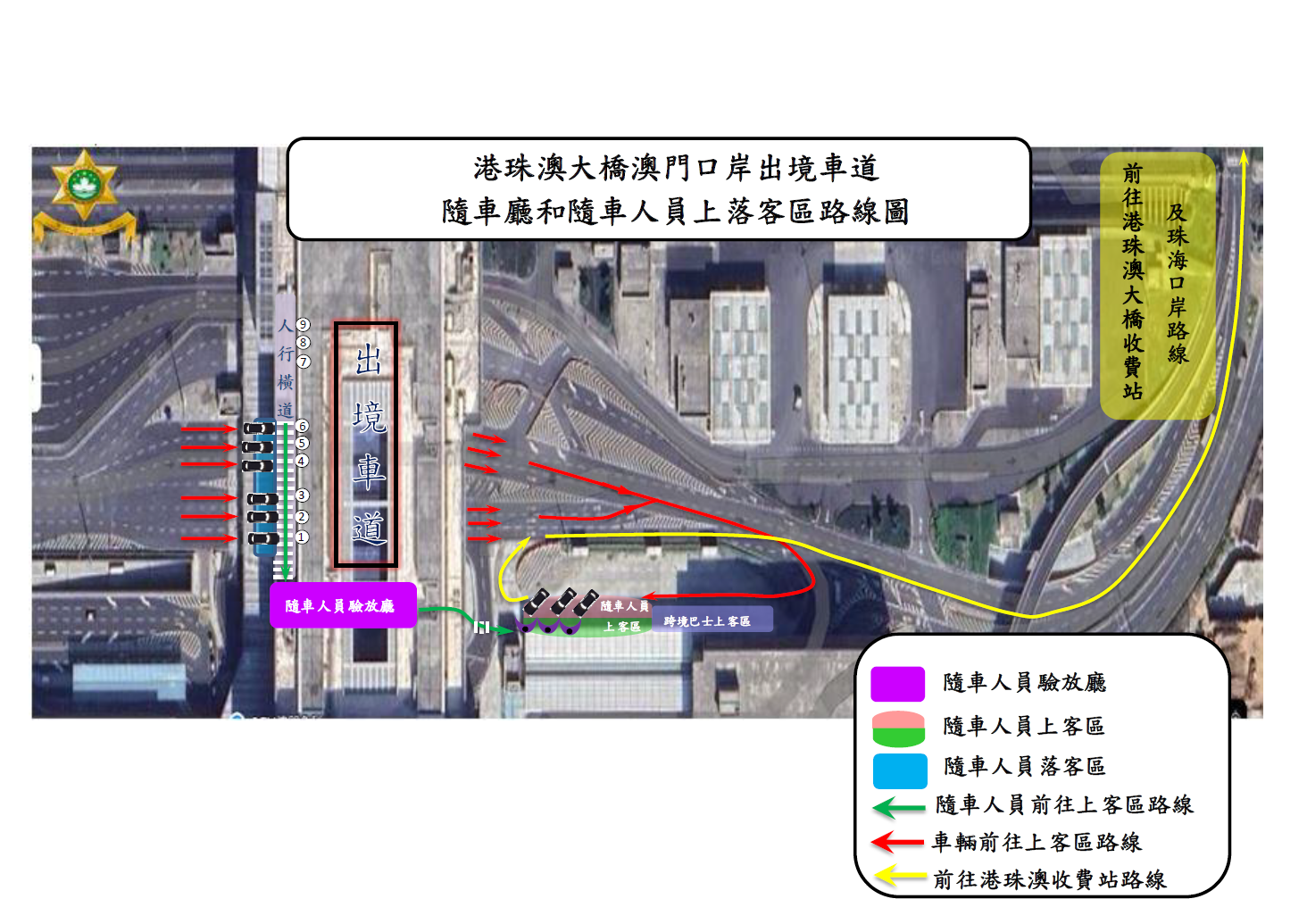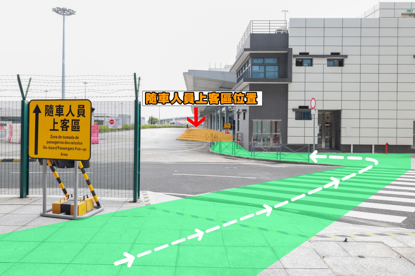 敬請駕駛者和乘客應留意現場指示牌及遵從工作人員指引,須使用隨車人員驗放廳的乘客沿人行橫道有序前往相關驗放廳辦理出境手續後,在隨車人員上客區上車。(圖一)
