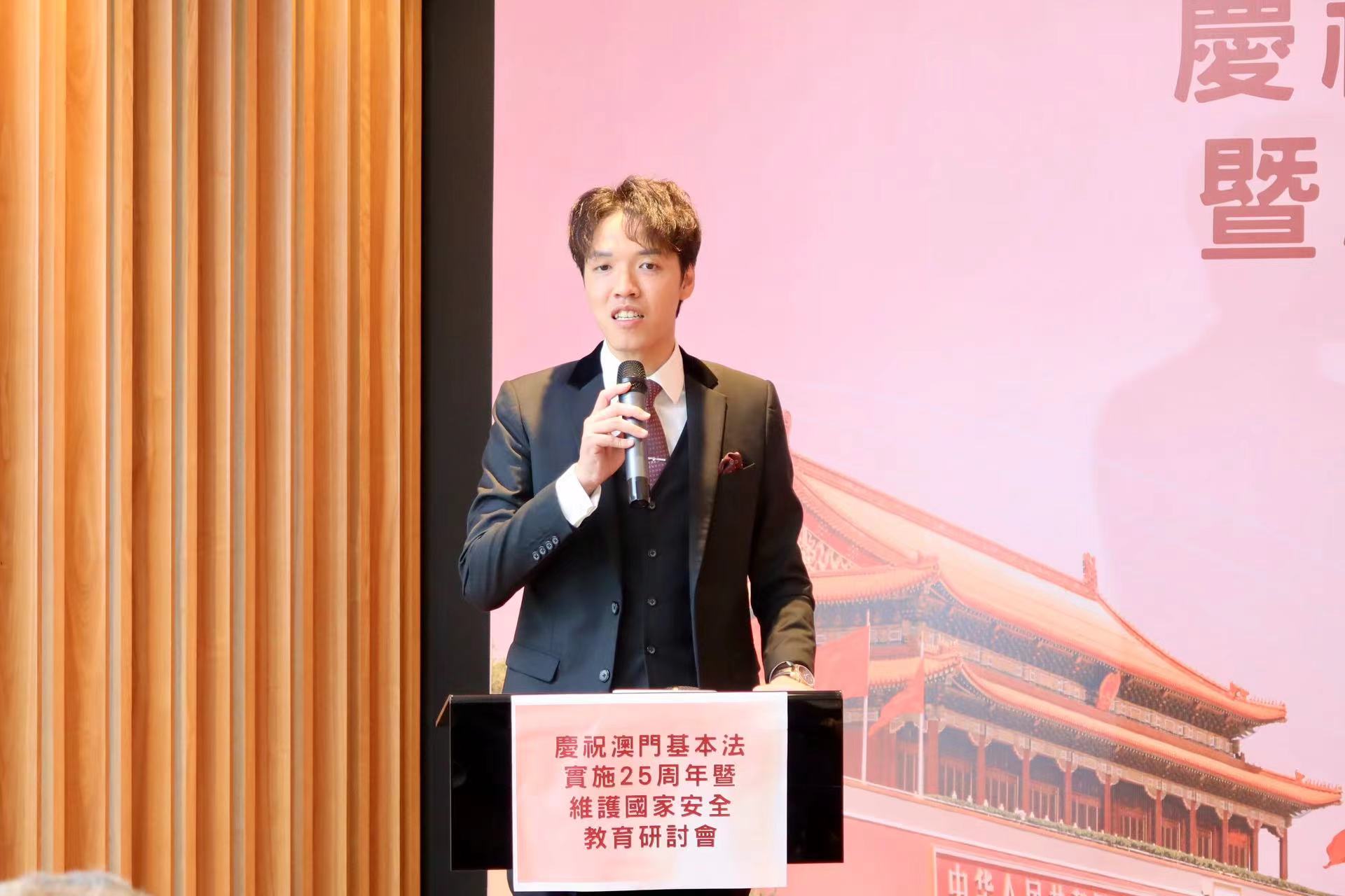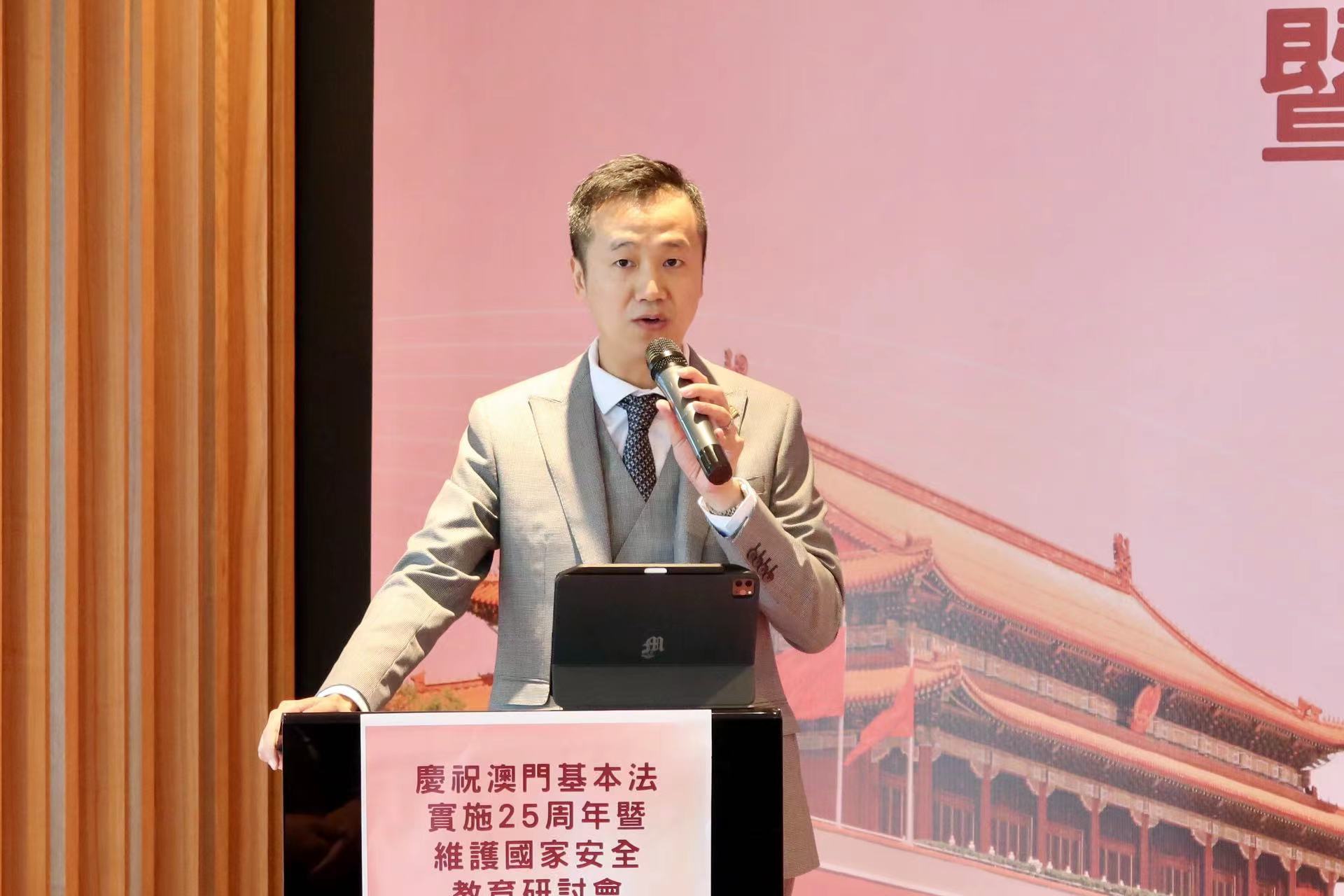 民众法律促進會會長麥興業致辭表示,自澳門基本法實施以來,澳門特區在國家政策的引領下取得了顯著的發展成果,在維護社會穩定、促進經濟繁榮方面發揮了重要作用。本次研討會的主要目的在於回顧和總結澳門基本法實施25年來取得的豐碩成果,探討國家安全教育的重要意義,希望與會者通過交流與討論,進一步加深對國家安全和法治建設的理解,共同探討如何更好地推進國家安全教育,進一步增強國家安全意識,促進澳門的持續穩定與發展。