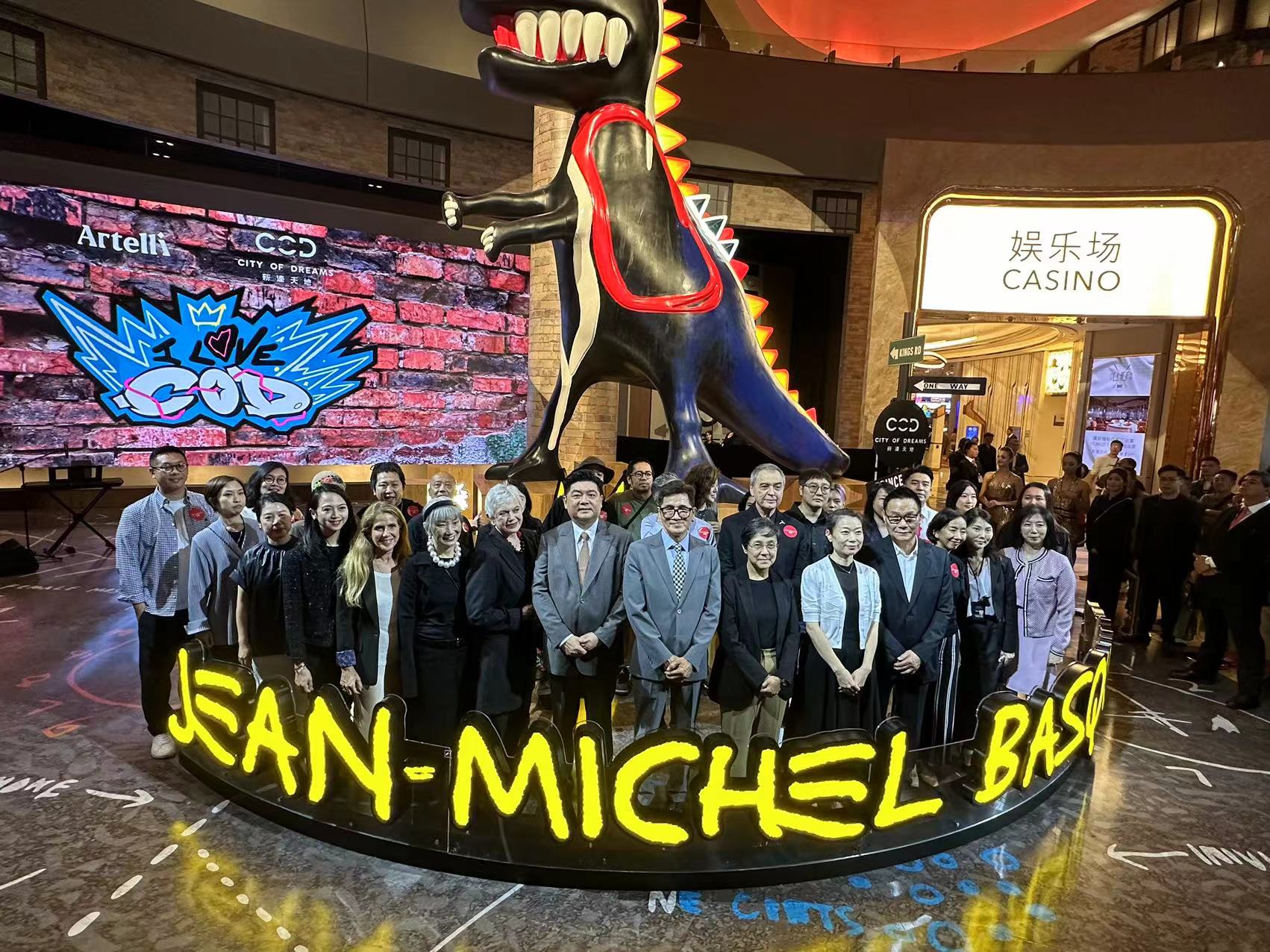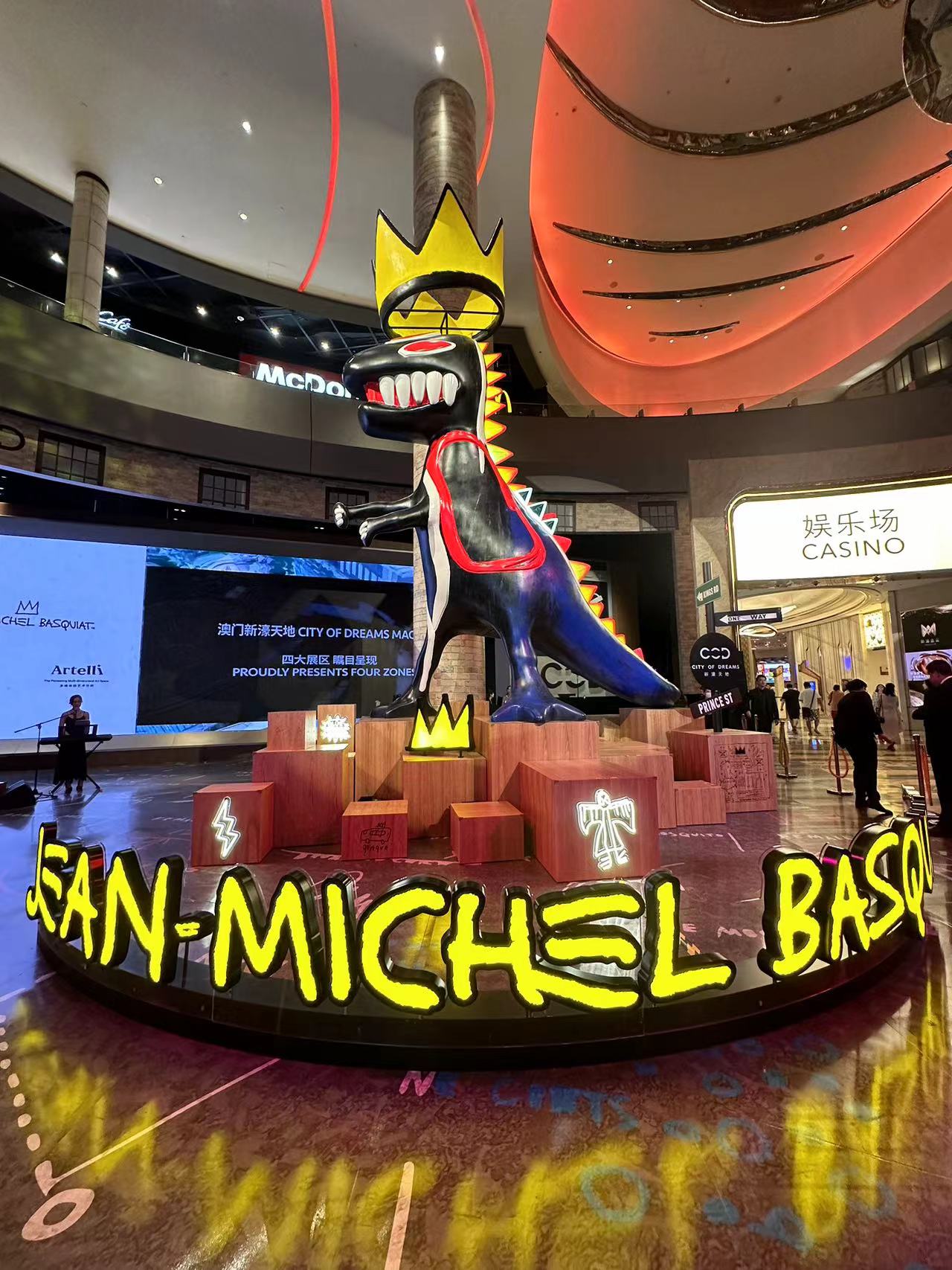 展覽期間,新濠天地主入口中央將展示一座取材自巴斯奇亞於1984年創作的經典作品《戴王冠的小恐龍》,約7米高的大型恐龍裝置。移步至西南門戶外空間,即可探索巴斯奇亞著名作品《棕點(安迪·沃荷作為香蕉的肖像畫)(1984)》的大型裝置,首次突破畫布的呈現方式,並以10米高的巨型藝術裝置矚目登場,帶來耳目一新的體驗;新濠天地The Showroom外牆更化作巨型藝術畫布展示《Grillo(1984)》作品,頂層以直徑約10米、高6米的王冠「加冕」,將藝術元素融入城市建築面貌以強烈的視覺衝擊力向觀賞者敞開一扇藝術之門,為金光大道帶來震撼的視覺效果。同時,觀眾亦可在多維體驗藝術空間Artelli一同探索傳奇藝術家巴斯奇亞的創作世界。
