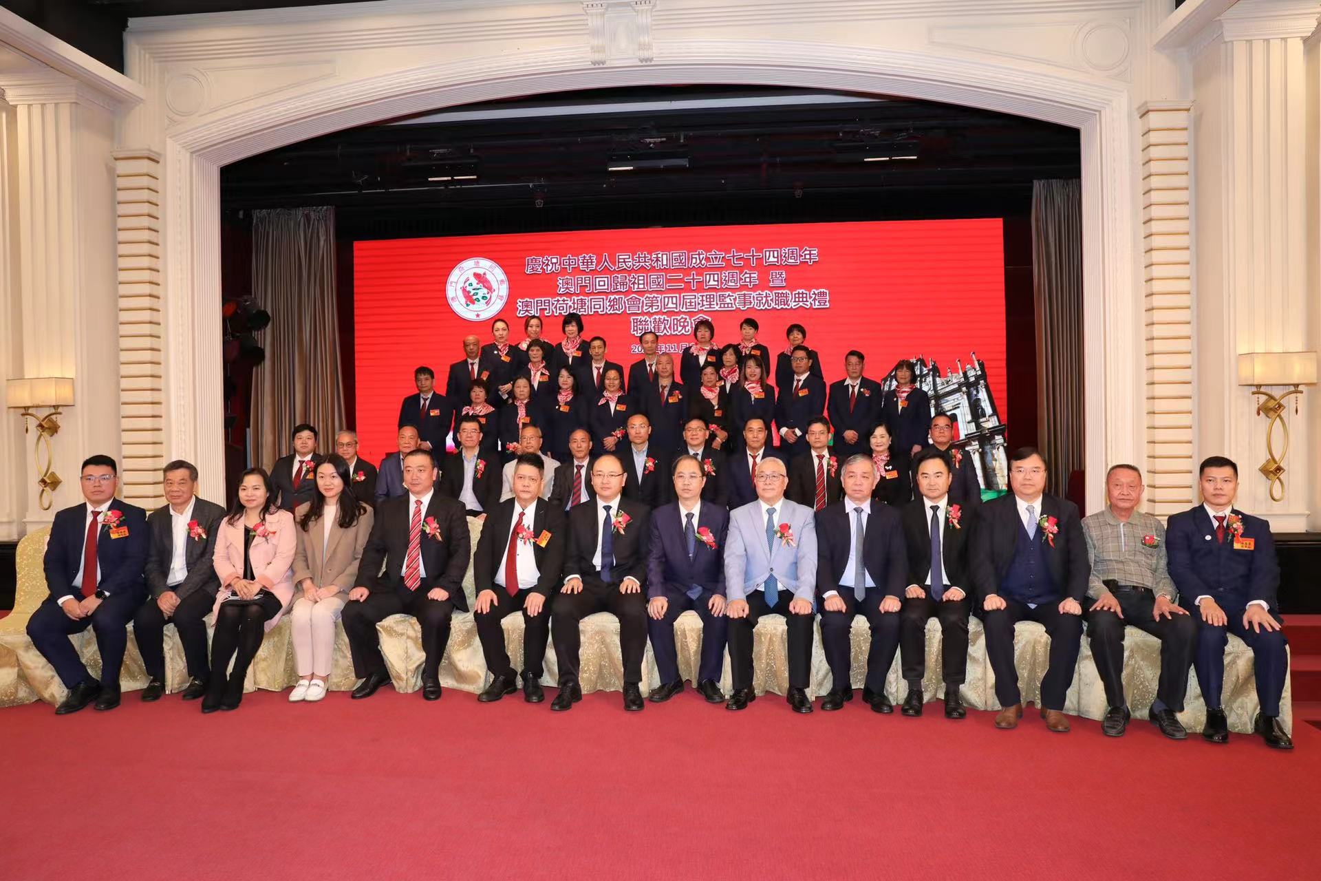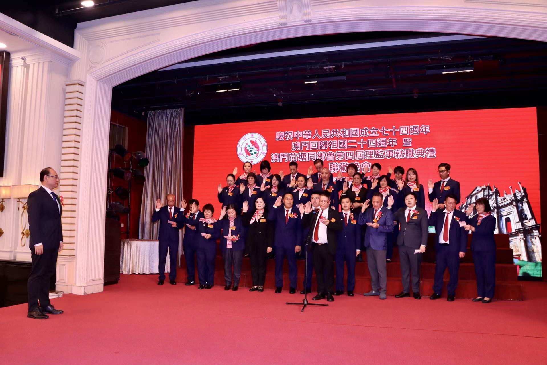 【即時新聞】澳門荷塘同鄉會晚上舉行慶祝七十四週年國慶、澳門回歸祖國二十四週年暨第四屆理監事就職典禮,在中聯辦協調部副部長劉冠宇的監誓下,該會第四屆會長黃德秋帶領新一屆理監事成員宣誓就職。