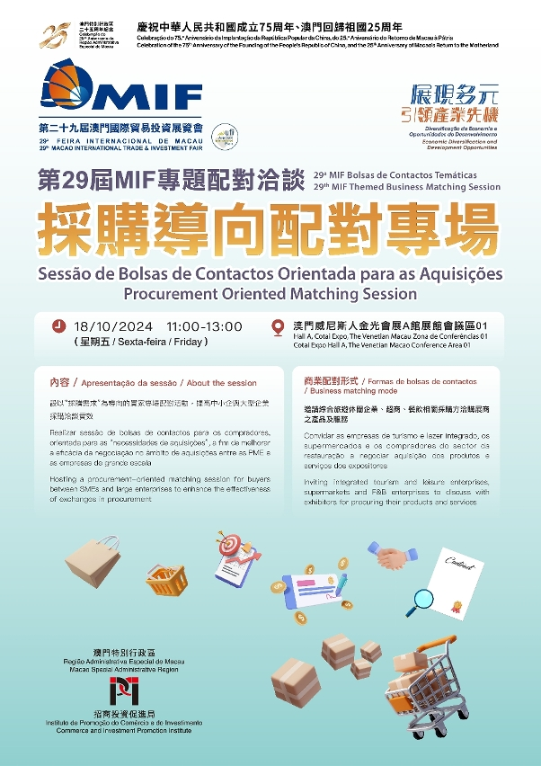 【即時新聞】慶祝中華人民共和國成立75周年、澳門回歸祖國25周年系列活動,“第二十九屆澳門國際貿易投資展覽會”(第29屆MIF)聯同“澳門國際品牌連鎖加盟展2024”(2024MFE)將舉辦合共8場專題配對洽談,為海內外展商客商創造“1+4”產業、中葡商貿、澳琴商機、國際連鎖品牌、IP產業等領域經貿交流平台,助參與各方對接國際資源,開拓商脈。