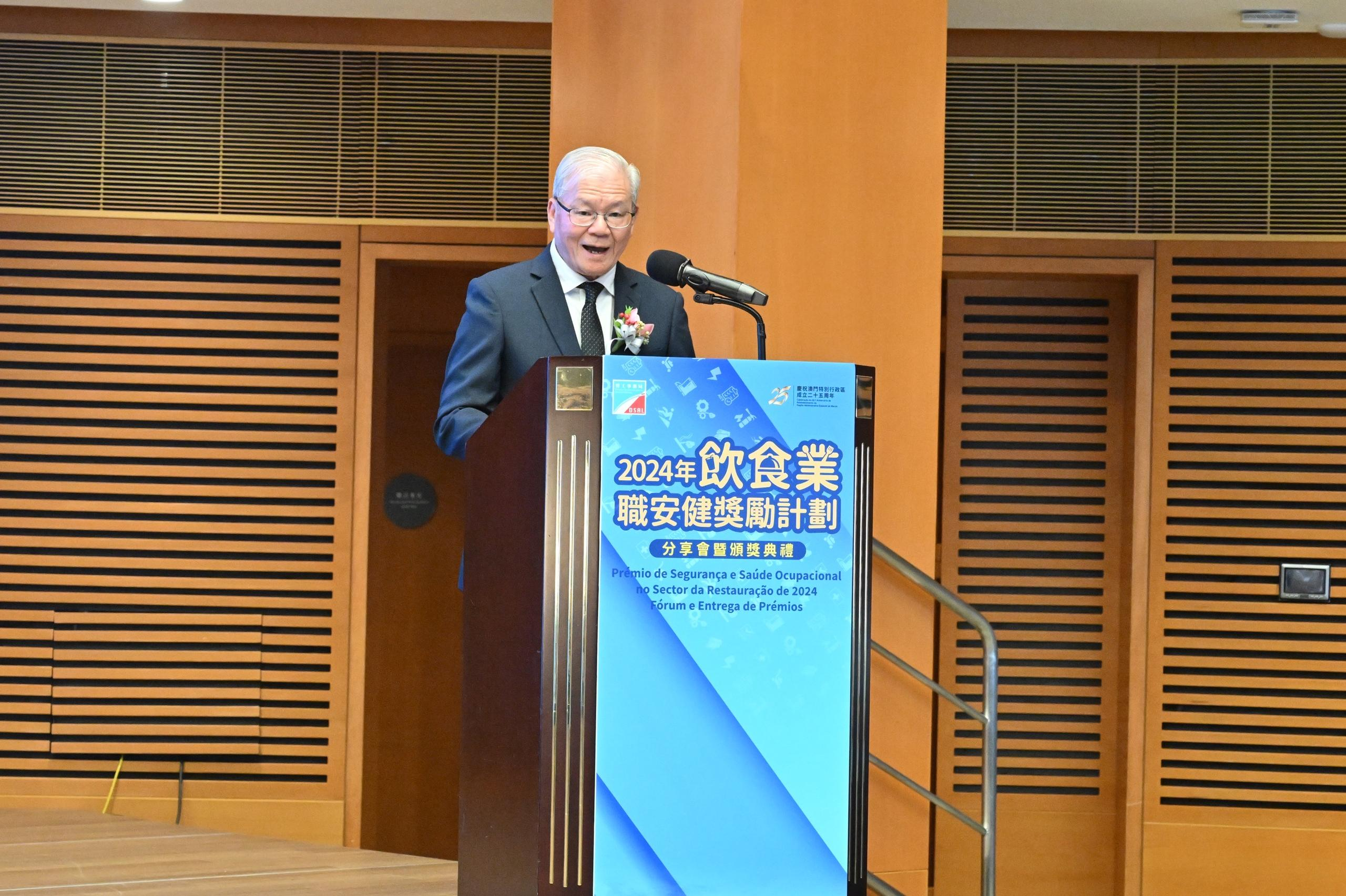 勞工事務局局長黃志雄致詞表示,澳門是著名旅遊城市,並擁有“創意城市美食之都”稱譽,是吸引遊客的重要賣點。飲食業對勞動力需求殷切,僱主必須為僱員提供安全及健康工作環境,僱員必須做好保護自己和他人工作安全的本分,共同提升職安健水平,減少工作意外發生的機會。勞工局會繼續積極鼓勵更多獨立經營或規模相對較小的餐廳一同參與獎勵計劃,進一步提升業界整體職安健水平,期待更多企業和從業員積極參與職安健推動工作,分享經驗與實踐,互相勉勵。