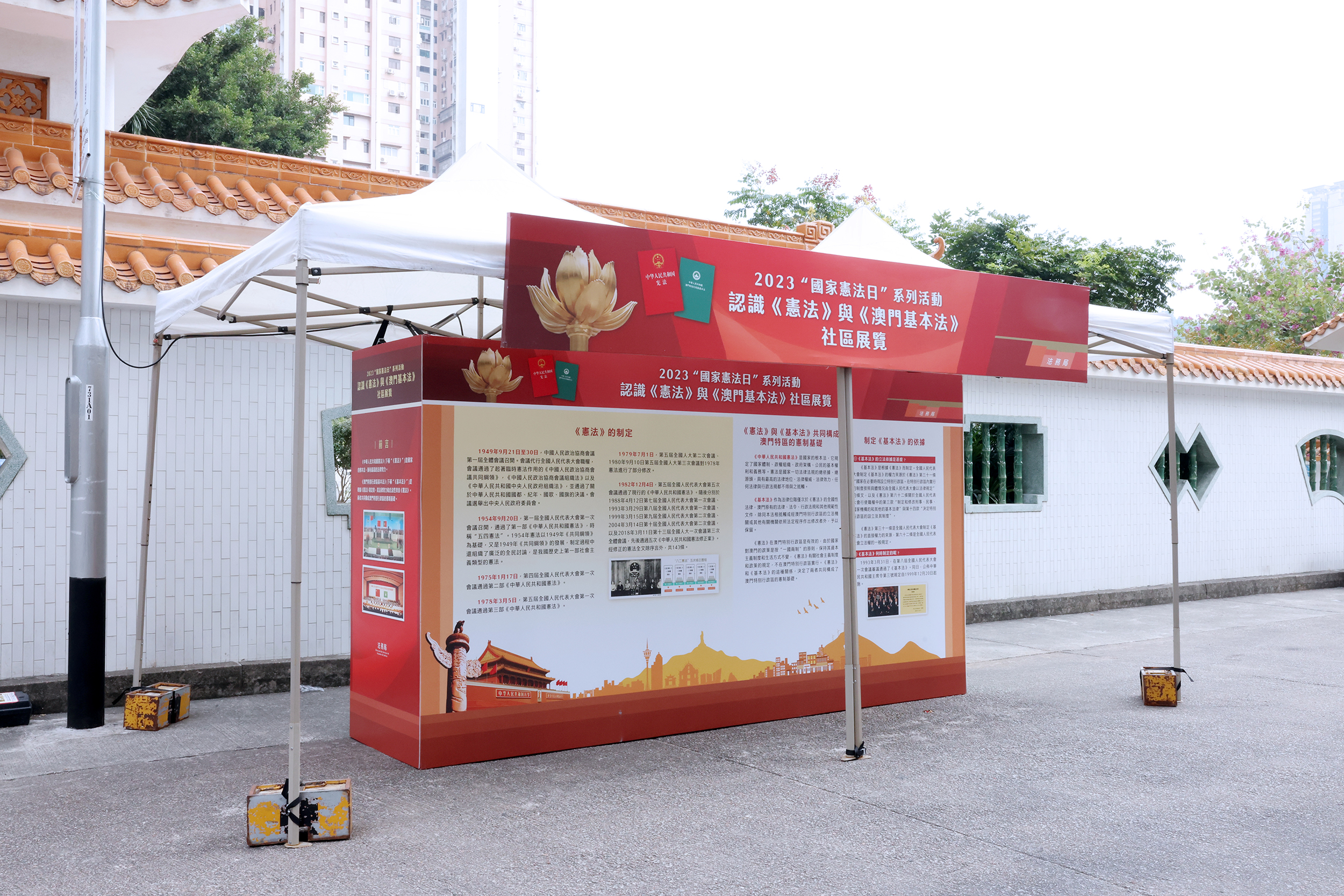 為加大普法覆蓋面,法務局已於花城公園及側之空地、紀念孫中山市政公園休憩區和華士古達嘉馬花園休憩區,以及澳門工會聯合總會、澳門婦女聯合總會、澳門街坊會聯合總會、澳門中華新青年協會和澳門中華學生聯合總會的服務點舉辦「認識《憲法》與《澳門基本法》社區展覽」,向市民介紹兩法的重點內容,展期分別至12月8日(公園休憩區)和12月10日(社團服務點),歡迎市民參觀。