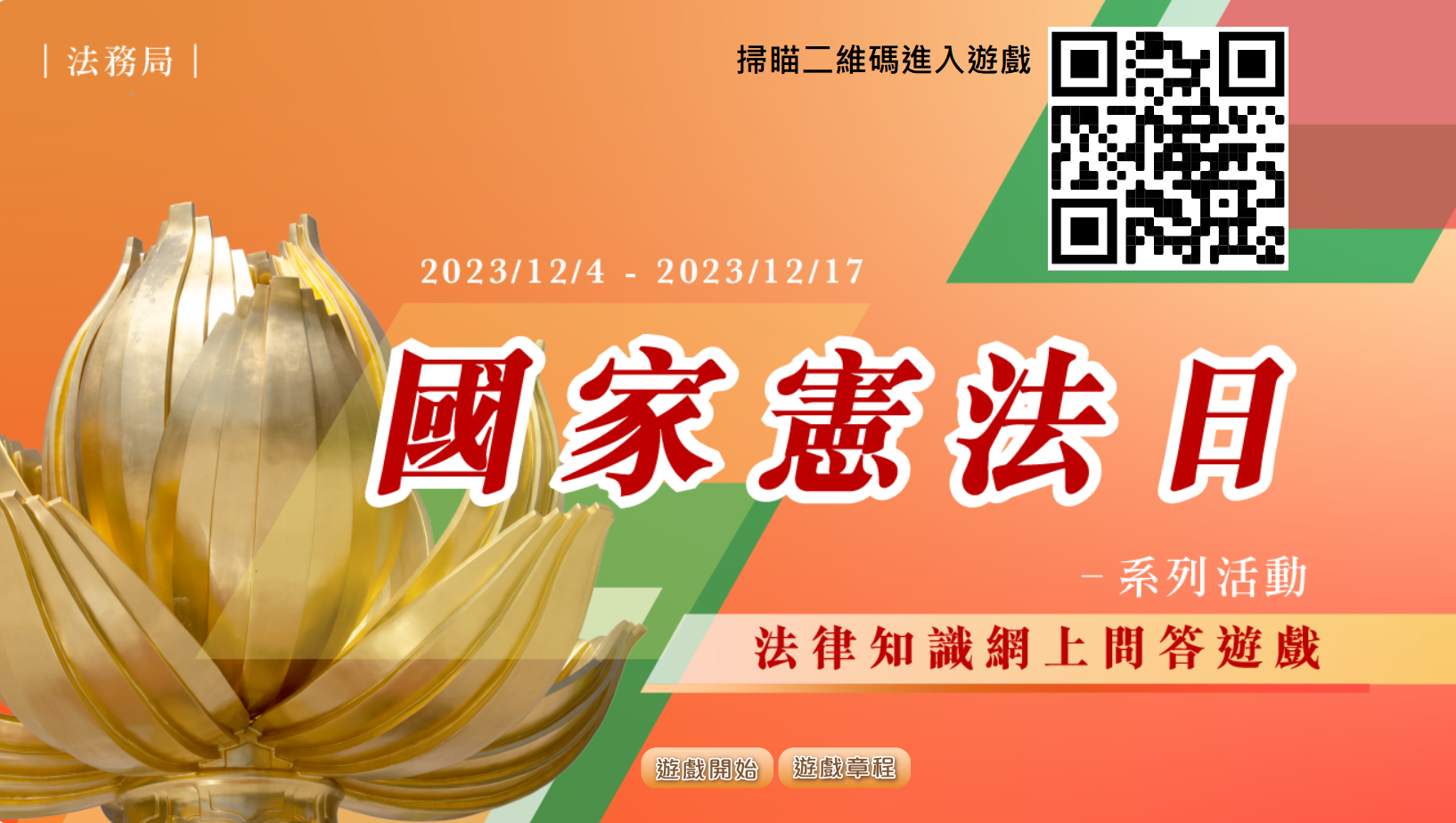 線上方面,法務局由即日起至12月17日舉辦「國家憲法日」法律知識網上問答遊戲,透過寓學習於娛樂的遊戲方式,加深市民對憲法的認識,參加者只需進入法務局網頁(https://app.dsaj.gov.mo/jogos)或法務局微信訂閱號的遊戲頁面,正確回答10條憲法法律知識的問題,便可參加抽獎,參加次數不限。遊戲設每日幸運兒及終極大抽獎兩部分,各得奬者將透過電腦系統隨機抽出。每日將抽出3名得獎者,將各得超市禮券100澳門元,所有完成遊戲的參加者均可自動參加12月18日的終極大抽獎,被抽出的5名得獎者將各獲得超市禮券1000澳門元,得獎名單將於遊戲頁面公佈,並會以短訊作出通知,活動章程可瀏覽法務局網頁。