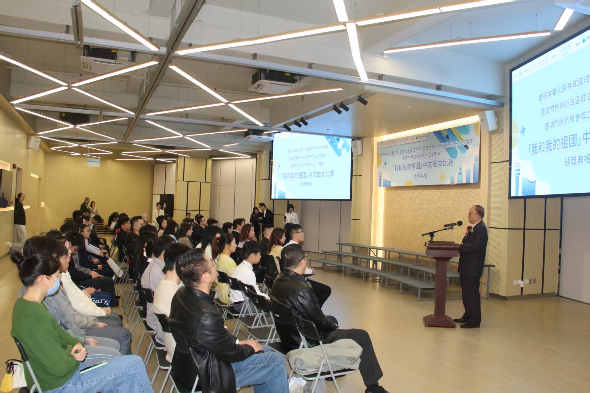 胡根致辭表示,今次活動舉辦具有多重意義,慶祝中華人民共和國成立七十五周年、澳門回歸祖國二十五周年,亦是民航學會成立二十周年。他代表學會向所有合辦及協辦單位表示衷心感謝,對所有獲獎學生表示熱烈祝賀。