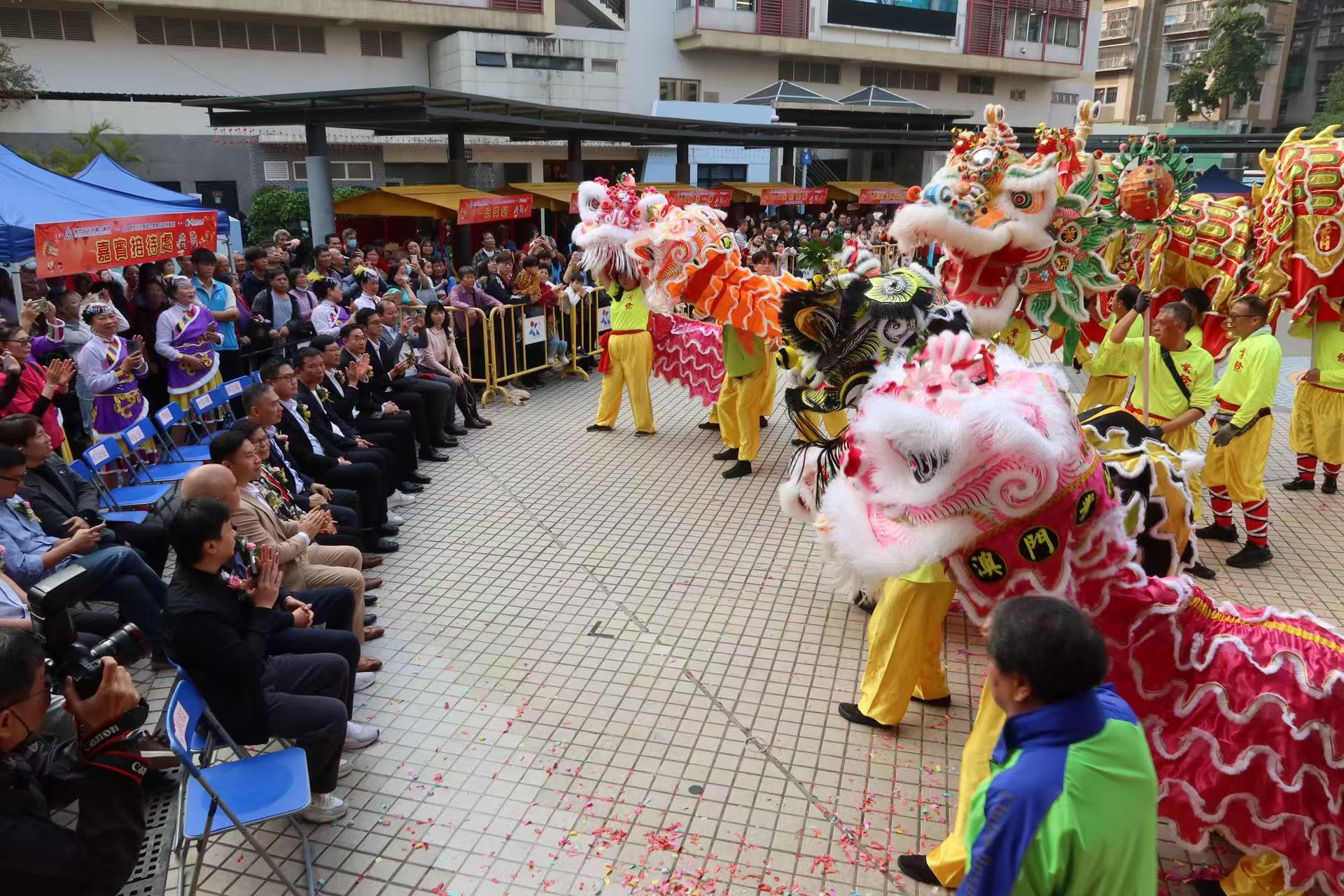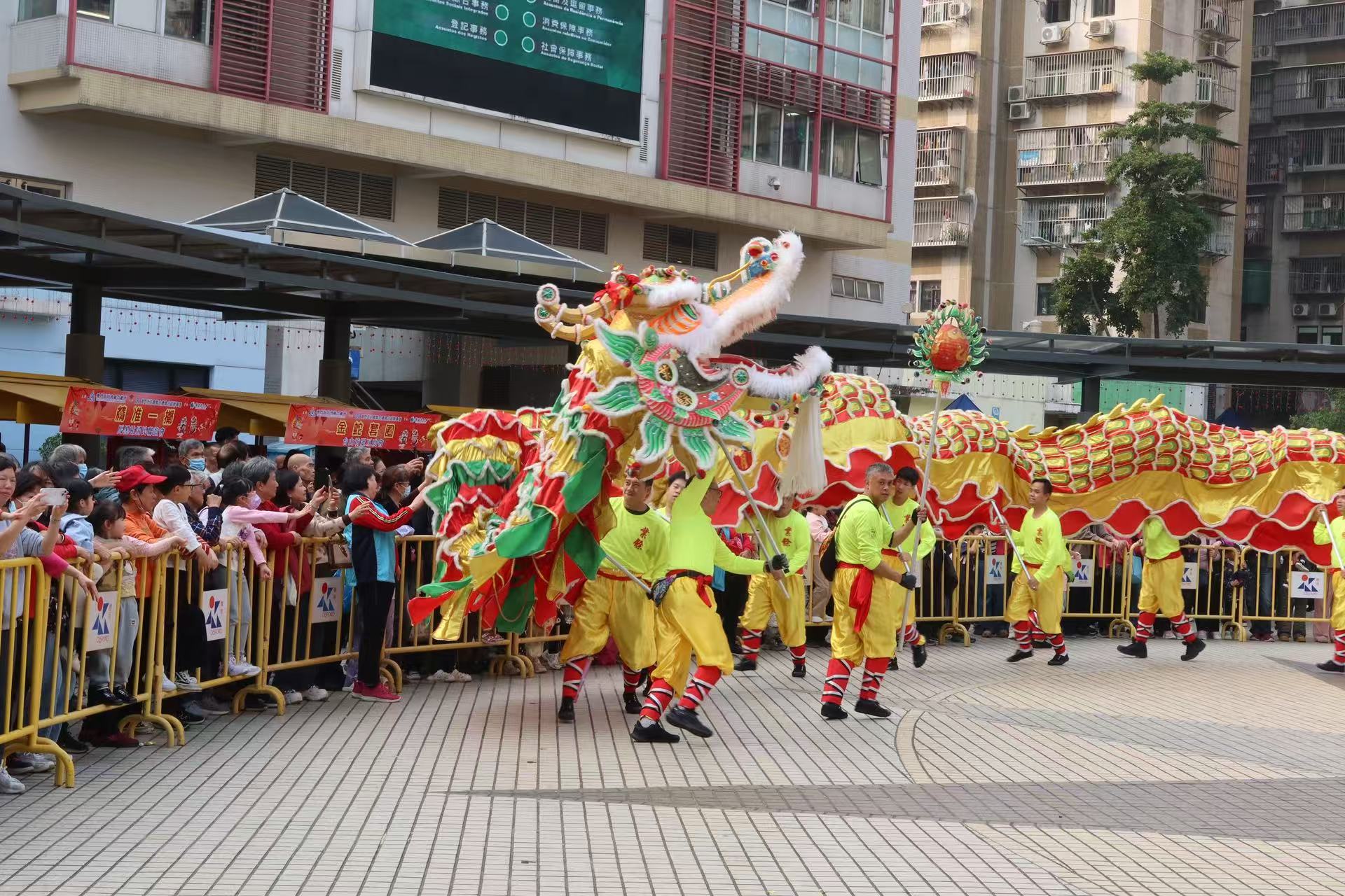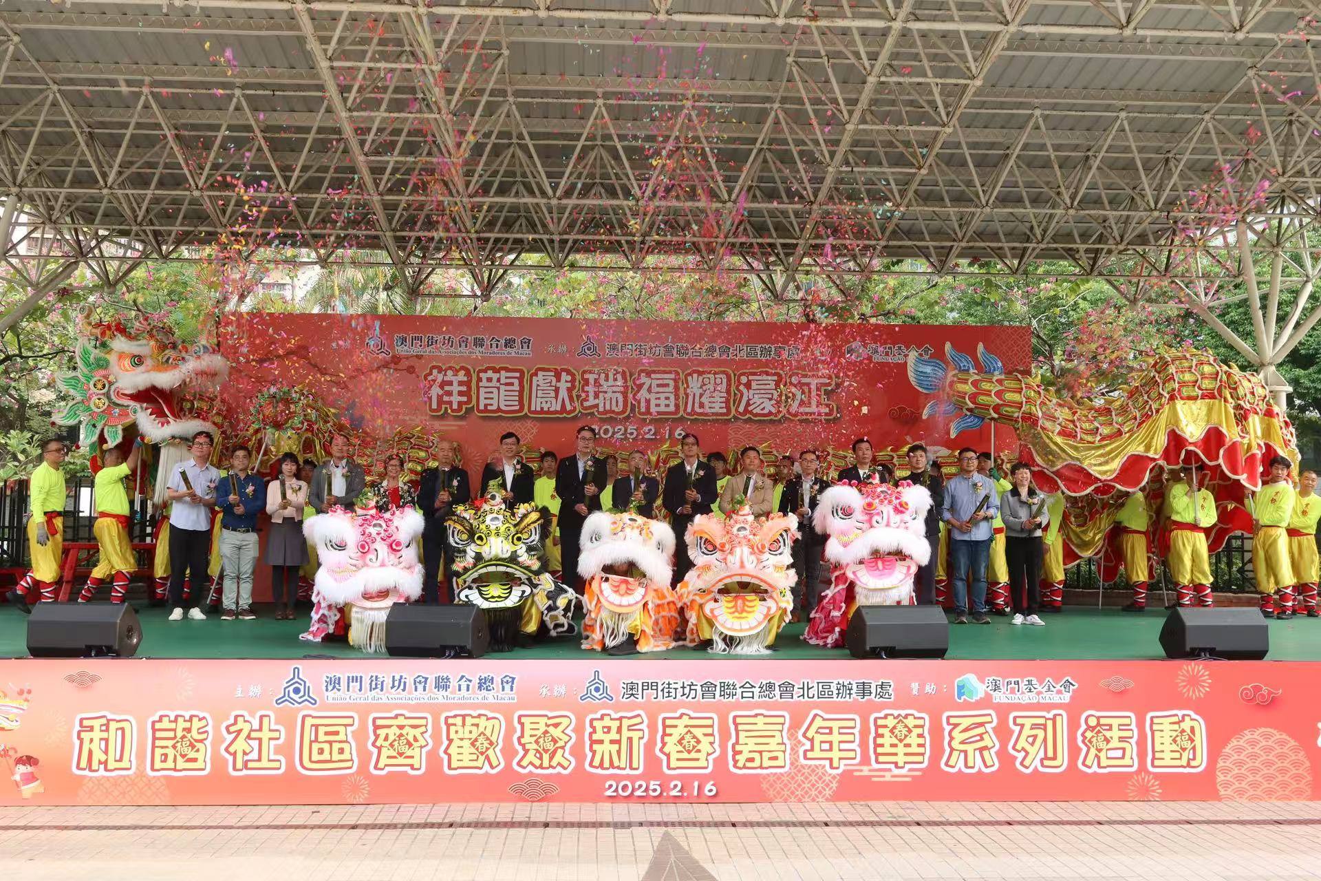 【即時新聞】街坊總會主辦、街總北區辦承辦之「祥龍獻瑞福耀濠江」賀歲活動下午在祐漢公園舉行,現場安排金龍醒獅獻演,並設豐富的歌舞表演及攤位遊戲等助興,與區內居民同賀新春,弘揚傳統文化,促進睦鄰聯繫。