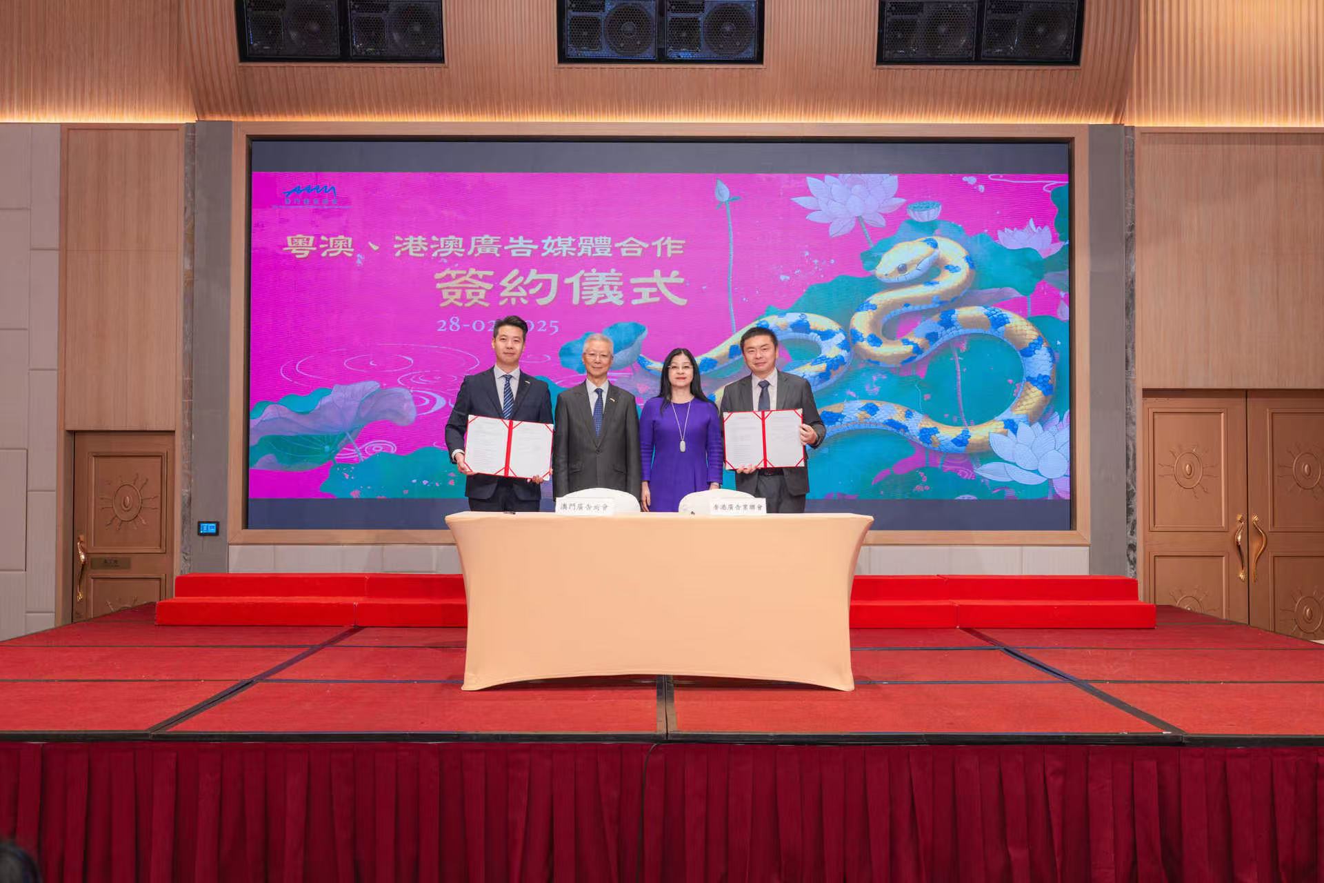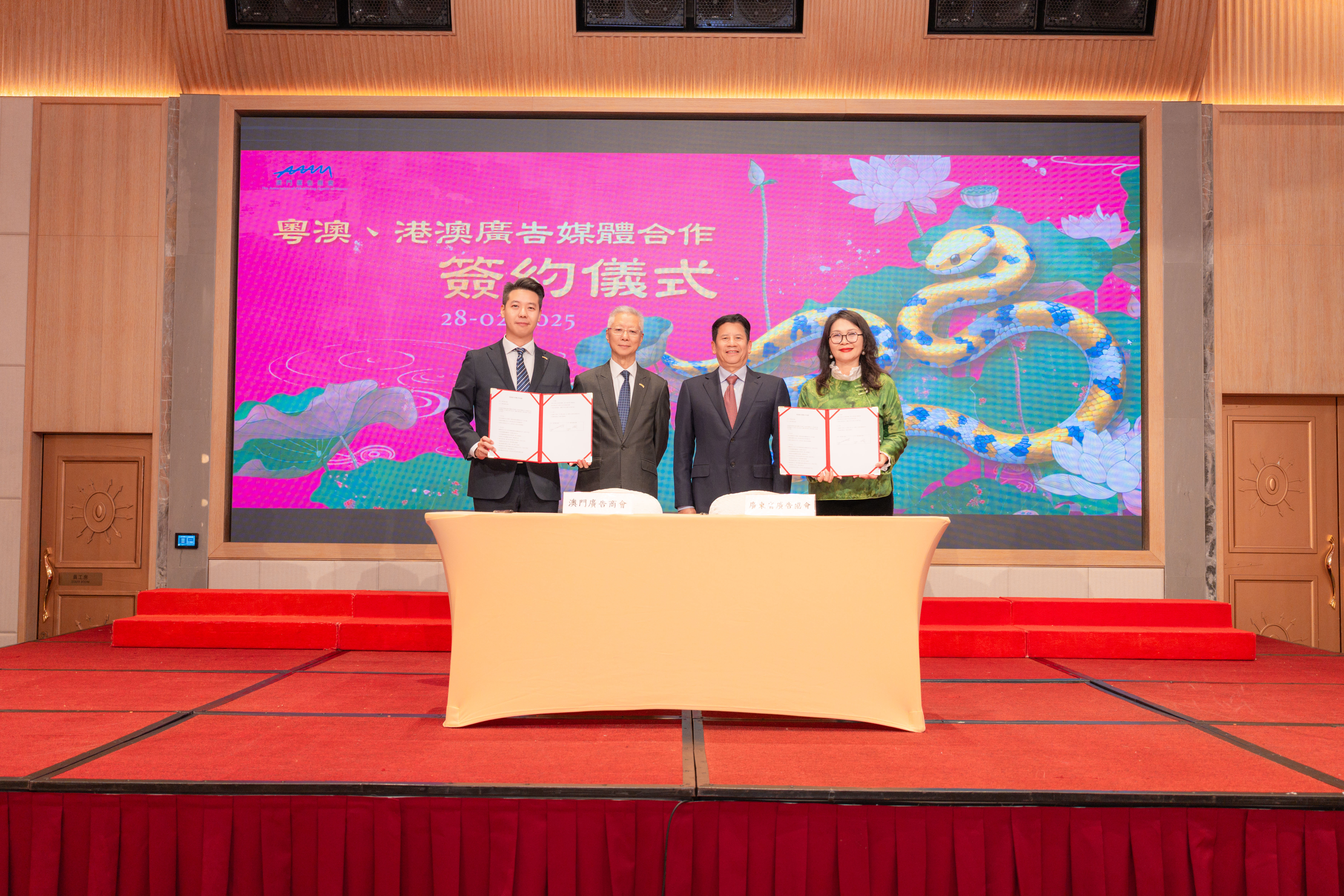 藉此25週年重要歷史節點,澳門廣告商會積極響應國家粵港澳大灣區建設戰略,致力於加強與大灣區各城市的緊密合作。晚宴上,澳門廣告商會分別與廣東省廣告協會、香港廣告商會簽訂了粵澳、港澳媒體合作協議,旨在深化大灣區廣告業界的交流合作,共同打造具有國際競爭力的廣告產業集群,推動大灣區文化創意產業繁榮發展。