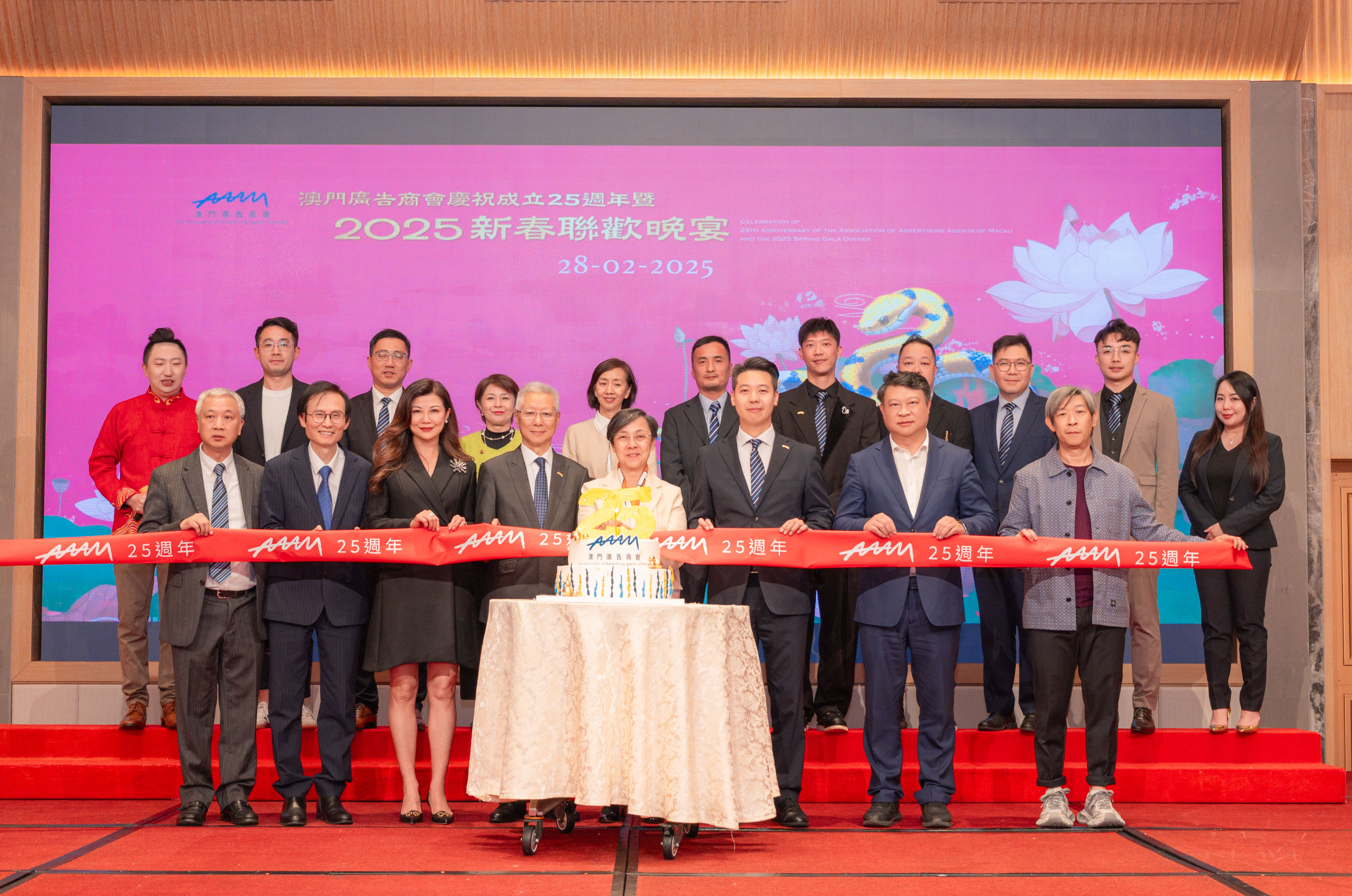 隨後,一眾嘉賓共同主持切蛋糕儀式,慶祝澳門廣告商會25週年華誕,並祝願澳門廣告業在新的一年裡再創佳績。