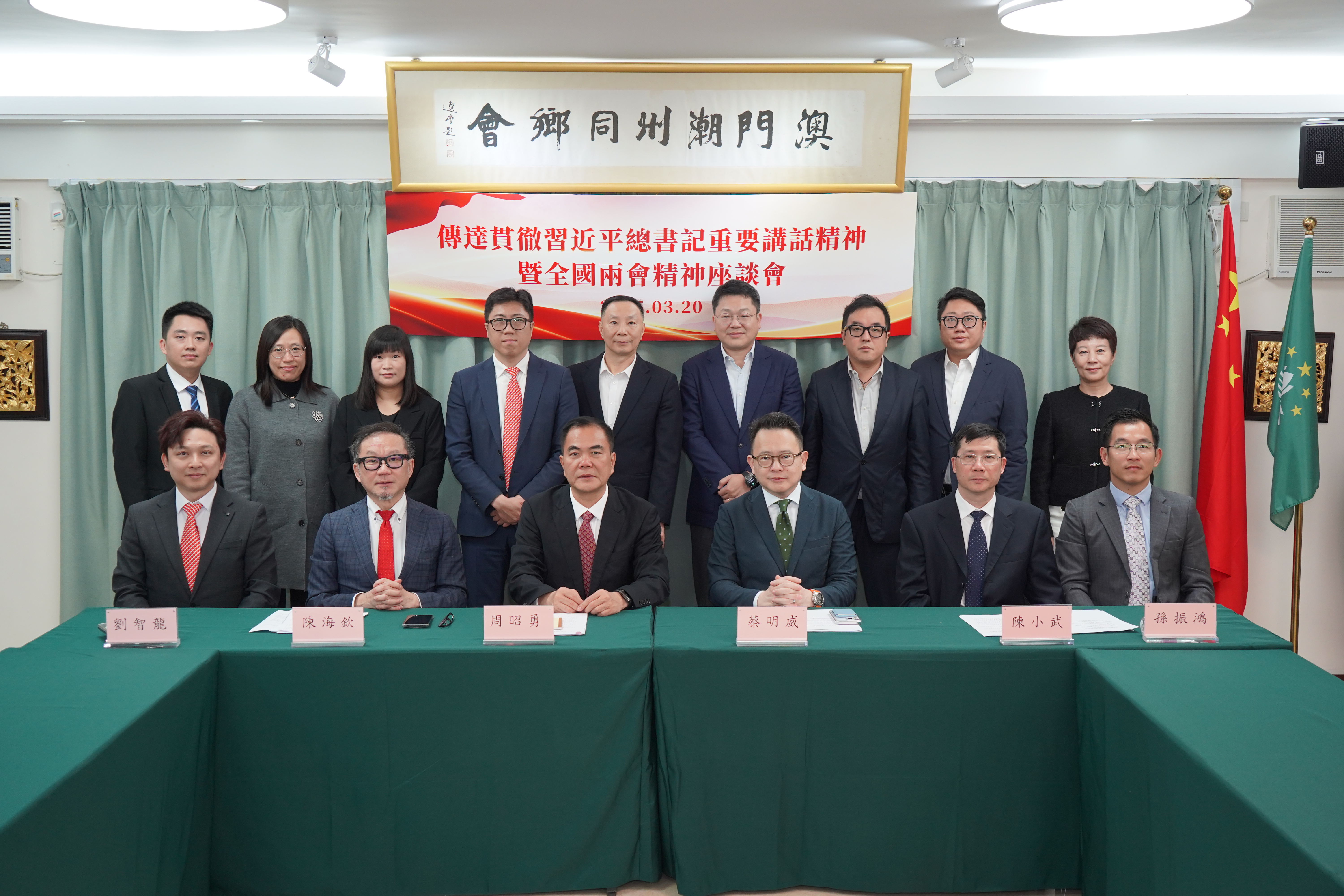 座談會由汕頭市政協副秘書長陳小武向全體傳達「兩會」精神而揭開序幕。接著由蔡明威向全體委員作「兩會」精神分享,他表示2025年全國兩會為澳門及粵港澳大灣區的發展指明方向。政府工作報告強調支持港澳融入國家大局,加快橫琴粵澳深度合作區建設,推動科技創新、數字經濟及區域協同發展,為澳門經濟多元化和青年發展提供新機遇。此外,澳門可依託橫琴及潮汕三市的資源優勢,由其是在文化交流等領域深化合作,推動「一帶一路」建設和國際經貿往來。兩會還提出優化民生資源共享,潮屬社團應將繼續發揮橋梁作用,鼓勵青年參與大灣區建設,共同推進澳門、橫琴與潮汕三市的繁榮發展,為國家和區域未來貢獻智慧與力量。
