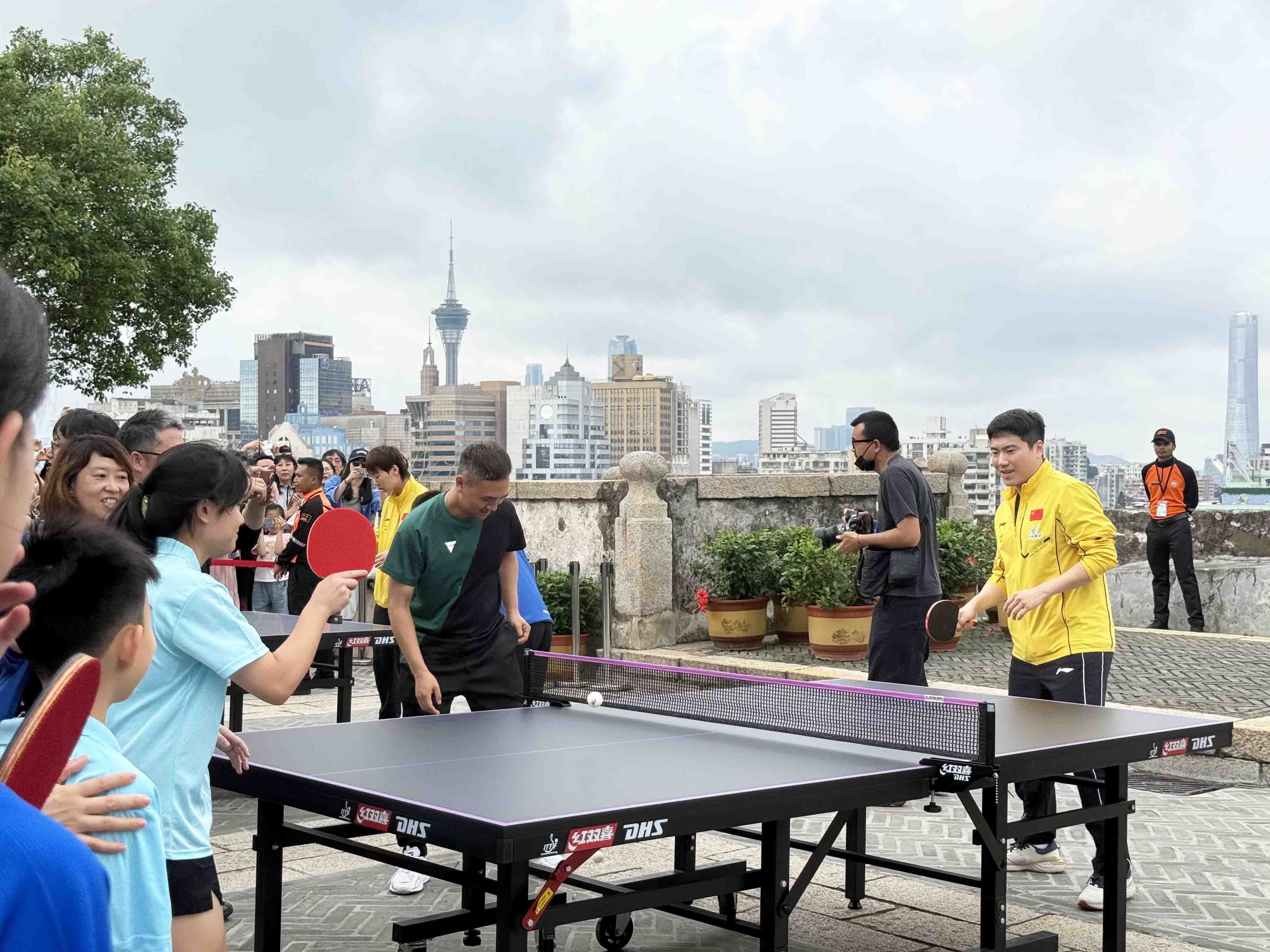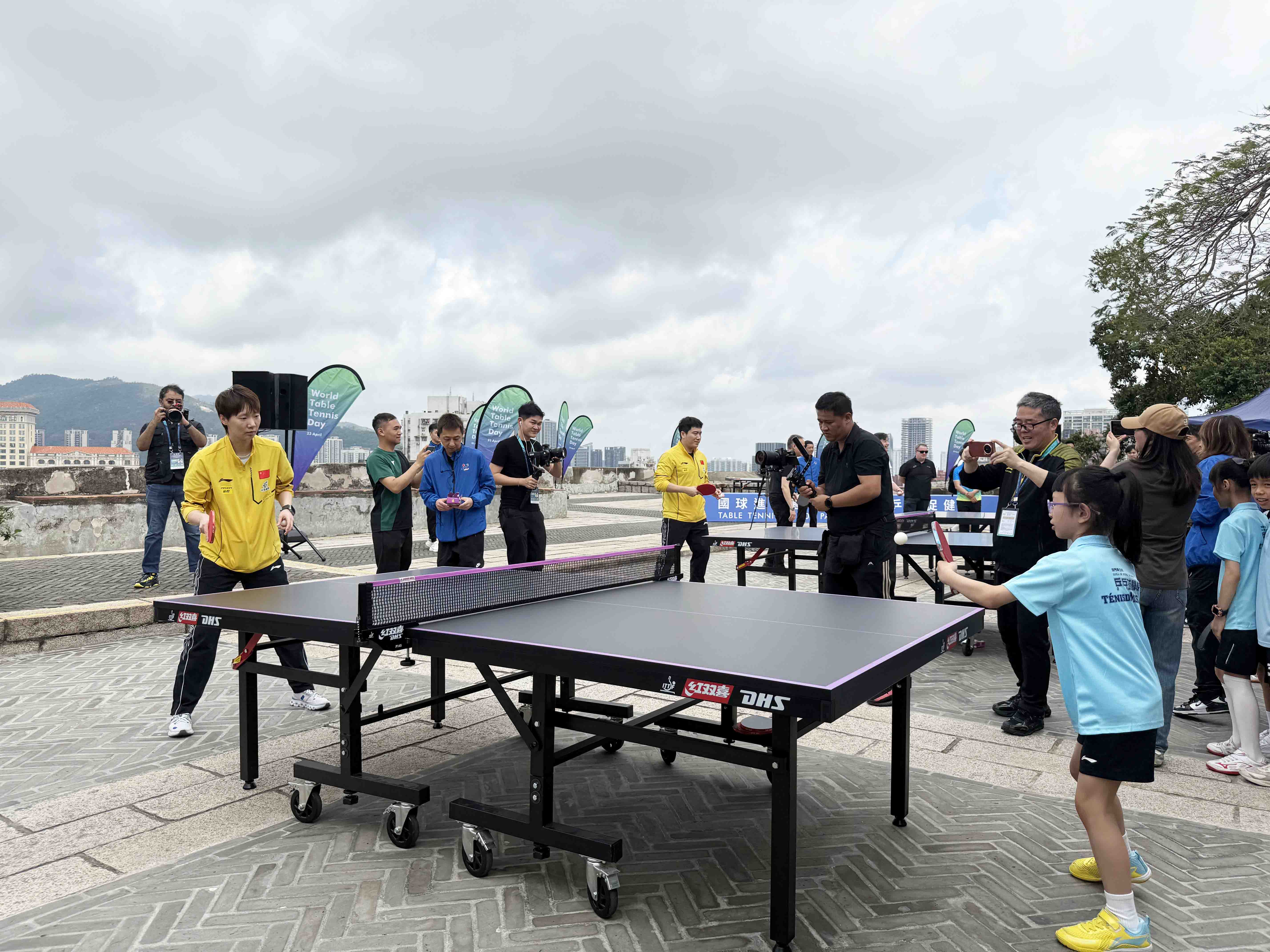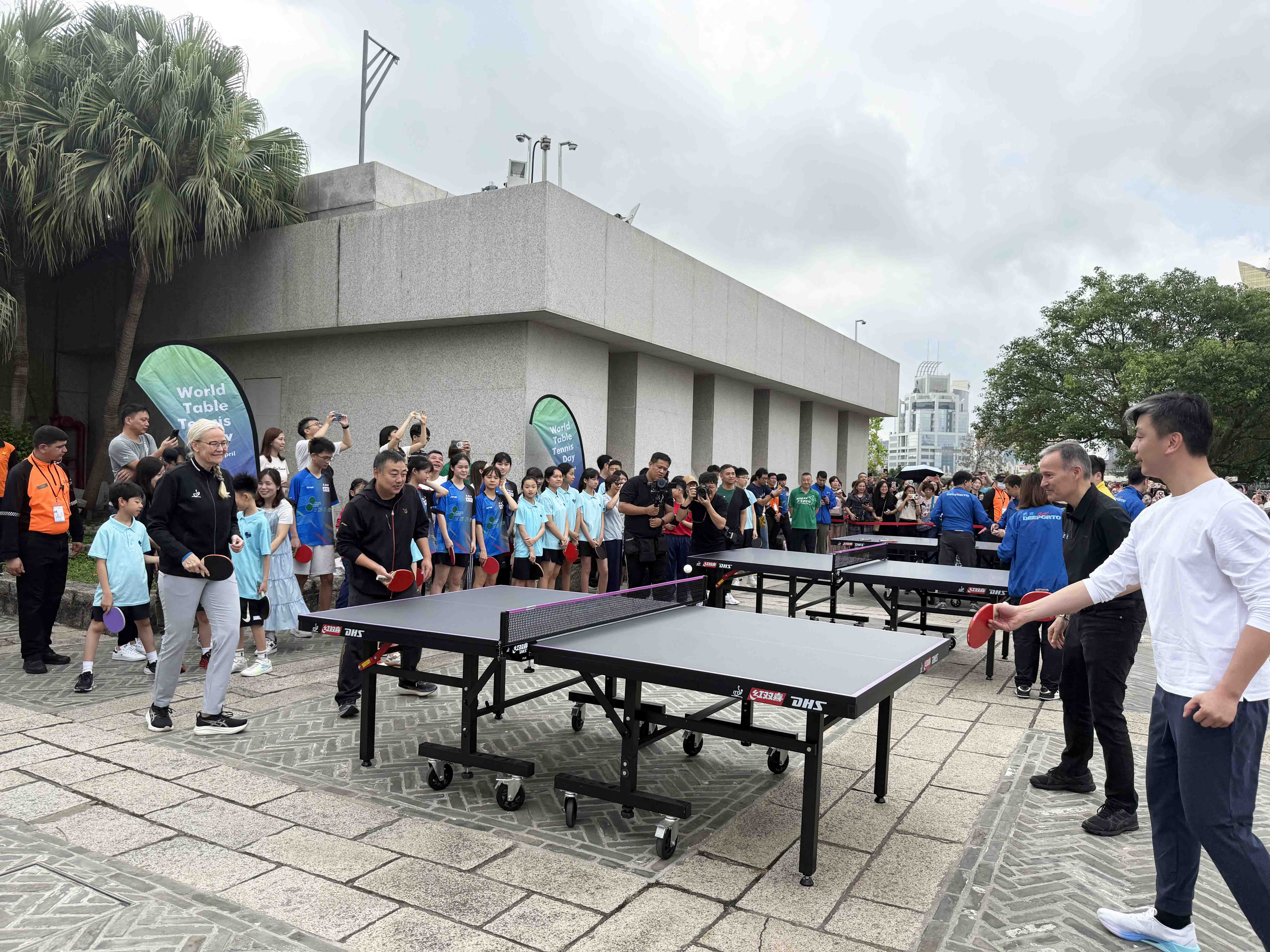 【即時新聞】由中國乒乓球協會與澳門體育局主辦,澳門乒乓總會協辦的“國球進公園暨慶祝2025年世界乒乓球日”活動,今日上午九時半在大炮台公園舉行。活動邀請國際乒聯主席索琳、副主席劉國樑、澳門體育局局長張子軒及乒總理事長許江雄,國家隊球員梁靖崑、王曼昱到場與三十名乒校學生互動交流。
