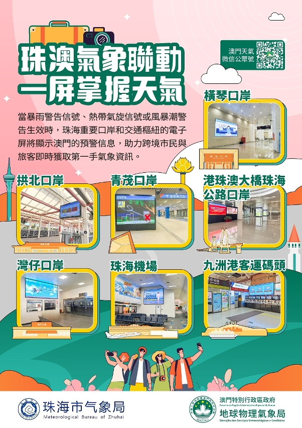 【即時新聞】為促進橫琴粵澳深度合作區(下稱合作區)的氣象服務,澳門地球物理氣象局與珠海市氣象局聯合推出“珠澳氣象預警”專頁,同時當澳門暴雨警告信號、熱帶氣旋信號或風暴潮警告生效時,珠海市7個重要口岸和交通樞紐共15處電子屏將顯示澳門預警信息,以期進一步便利跨境市民和旅客瞭解珠澳兩地的氣象預警資訊,從而更好地規劃行程及做好應對措施。