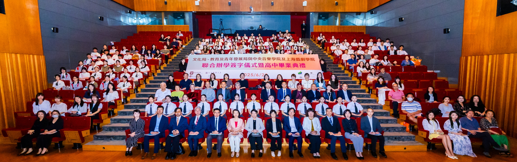【即時新聞】文化局、教育及青年發展局與中央音樂學院及上海戲劇學院於6月28日在澳門文化中心小劇院舉辦聯合辦學簽字儀式,並同日舉行文化局澳門演藝學院舞蹈學校第八屆舞蹈職業技術高中畢業典禮,以及音樂學校第十二屆音樂職業技術高中畢業典禮,一眾嘉賓、師生、家長出席及見證。