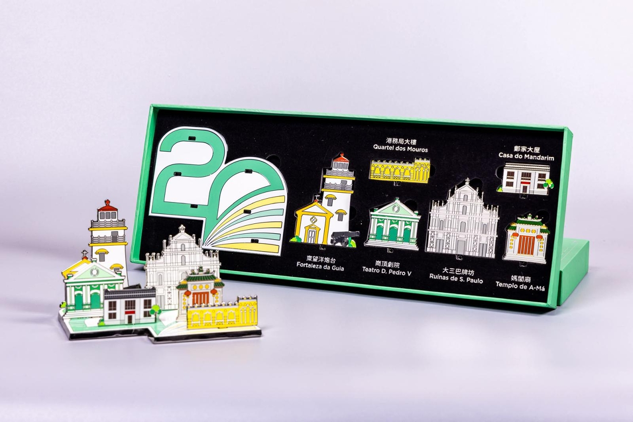 此外,文化局特別推出限定版金屬襟章套裝,可作為獨立時尚小飾品,亦可自由組合為獨特的“澳門歷史城區”精美擺設,套裝於文化局轄下大三巴牌坊詢問處、益隆炮竹廠禮品店、觀音蓮花苑禮品店、澳門國際機場的“澳門好店──澳門文創產品店"限量發售,歡迎公眾選購。