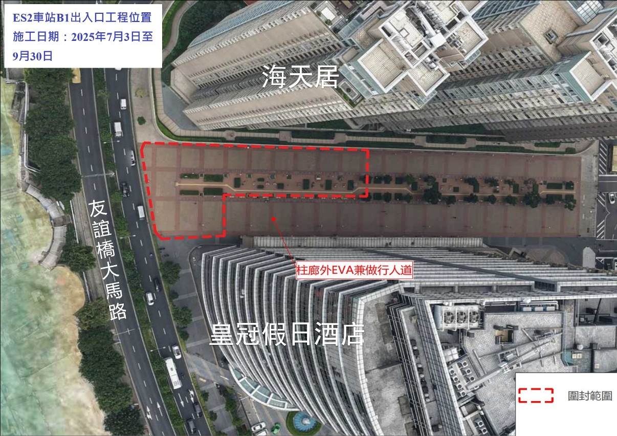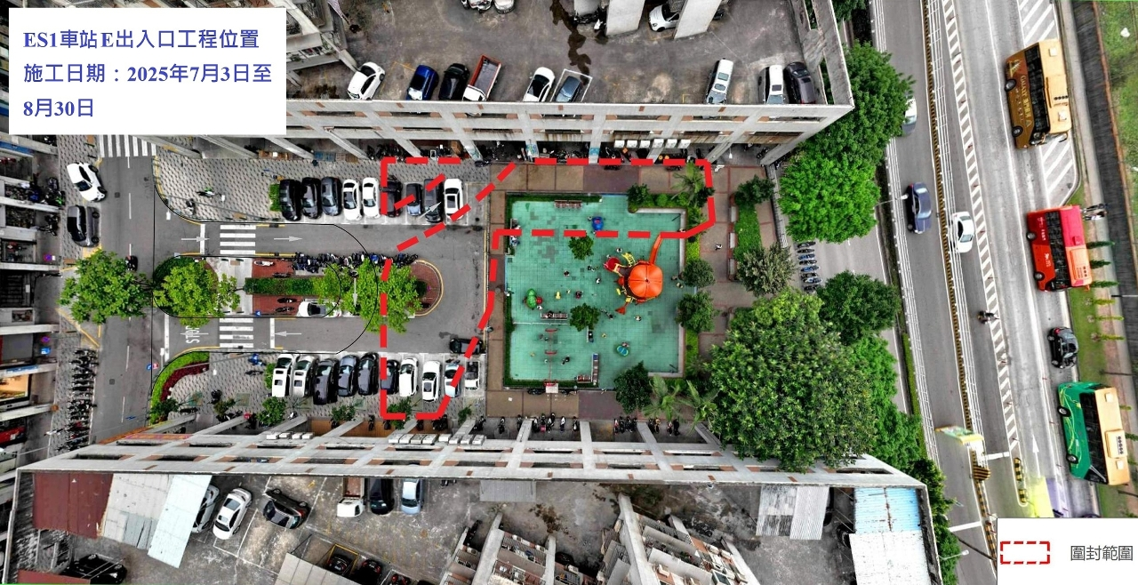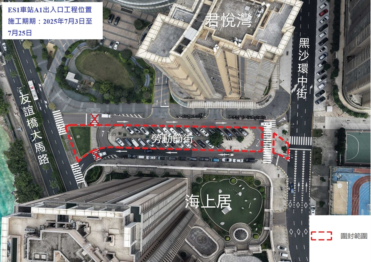 是次三個出入口工程分別是位於勞動節街的ES2站A1出入口、位於東方明珠街的ES2站B1出入口以及位於如意廣場的ES1站E出入口,將自7月起分階段施工。首階段會進行管線遷移、地下管線鋪設、重整行車道及依照市政署指引及要求對合適的樹木進行遷移等。配合施工,7月3日至12月31日,如意廣場、友誼橋大馬路與黑沙環中街之間的一段勞動節街實施有限度通車,如意廣場及勞動節街部份咪錶泊車位暫停使用;7月14日至12月31日,勞動節街近黑沙環中街的電單車泊車位暫停使用;而工程範圍之休憩區則暫停開放。