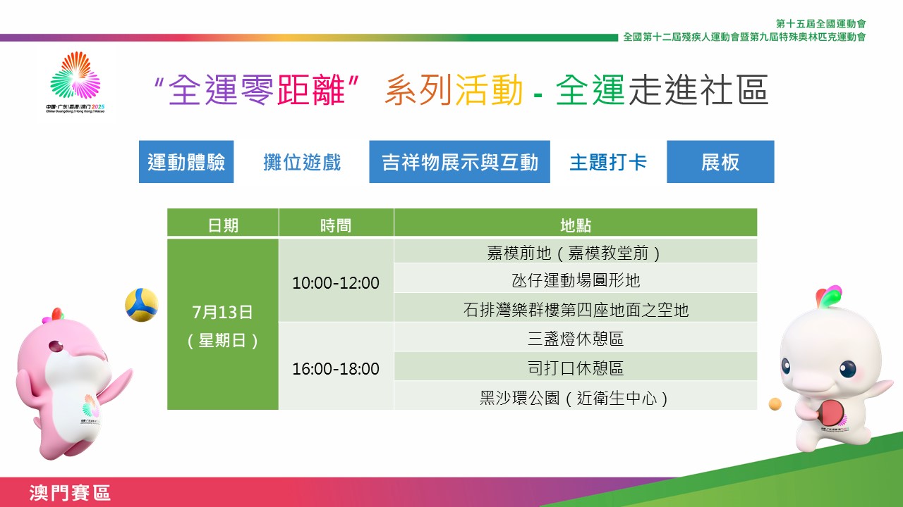 是次活動將在本澳不同社區舉行,現場設有趣味攤位遊戲、全運會知識展板、吉祥物展示、主題打卡裝置等,參加活動者均有機會獲得十五運會和殘特奧會澳門賽區精美紀念品,誠邀大眾齊來感受全運魅力。