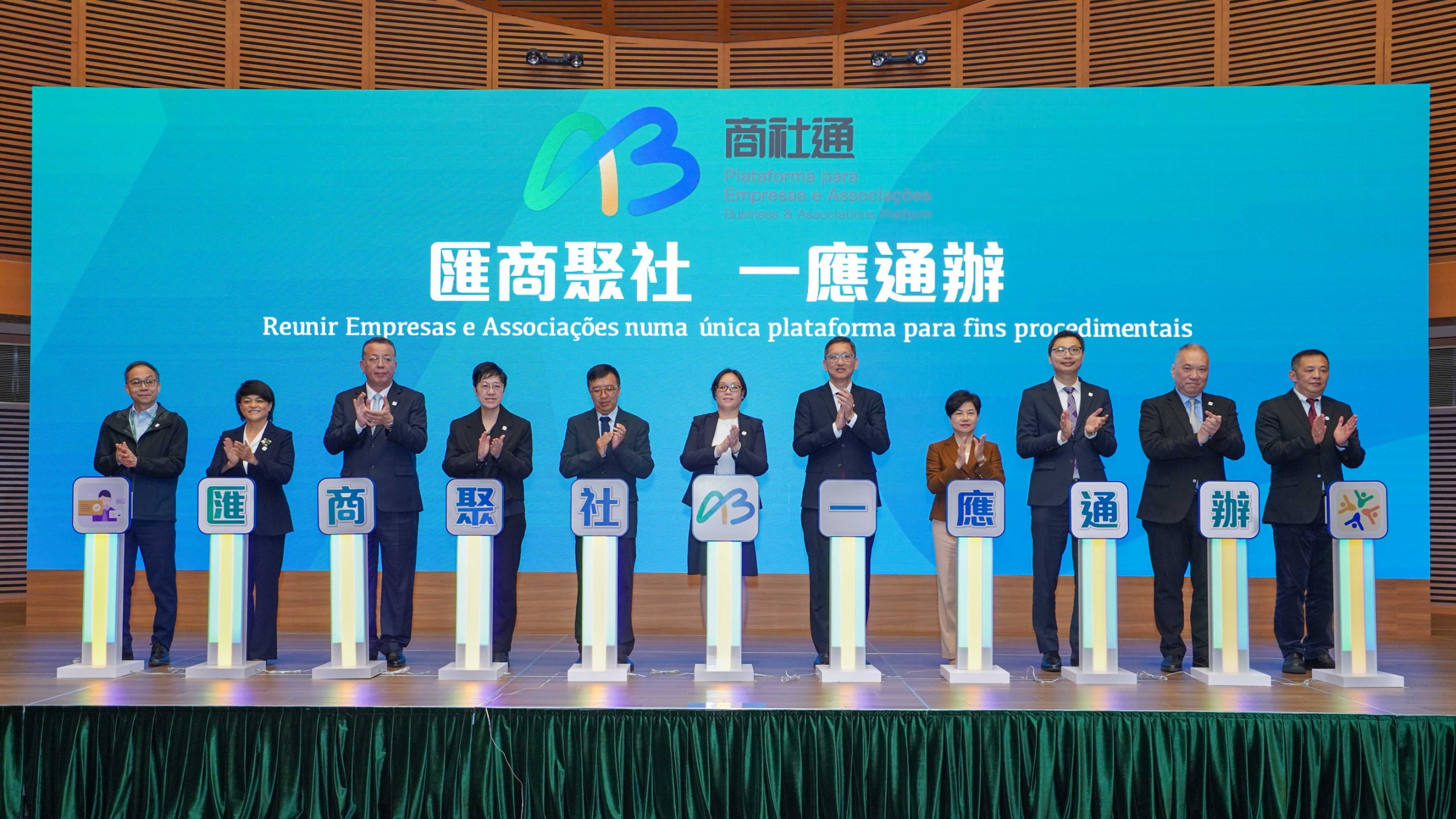 特區政府1月9日於澳門科學館舉行「商社通」發佈會,由行政公職局局長吳惠嫻、身份證明局局長周偉迎、市政署市政管理委員會主席戴祖義、社會保障基金副主席袁凱清、財政局資訊系統廳廳長張子健、土地工務局准照處處長區炳堅、消防局副消防總長吳家偉、澳門中華總商會理事長馬志毅、澳門工會聯合總會理事長李從正、澳門街坊會聯合總會會長吳小麗、澳門婦女聯合總會會長劉金玲擔任啟動儀式的主禮嘉賓,其他出席發佈會嘉賓還包括各政府部門及各界商社代表。