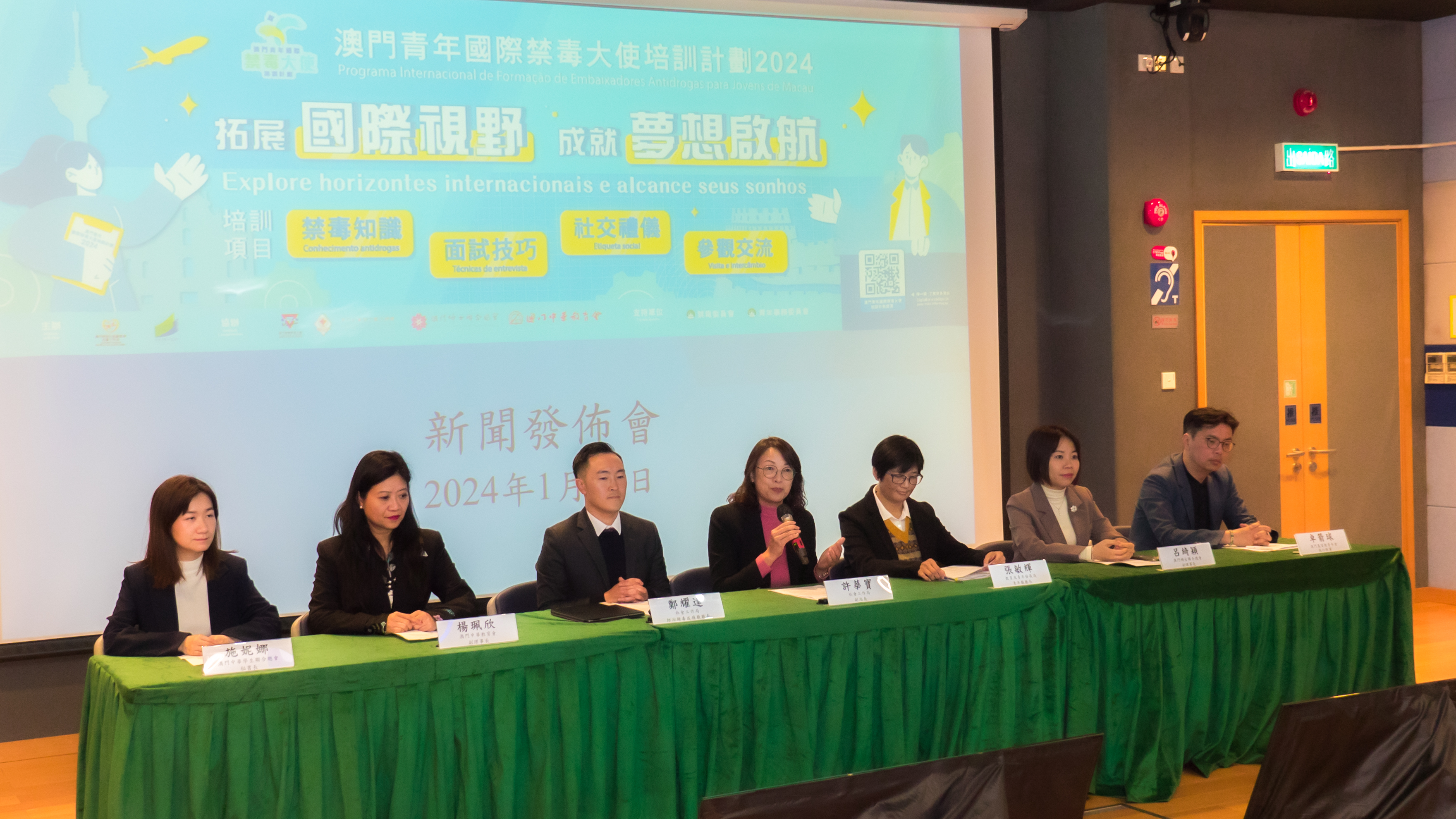 【即時新聞】由社會工作局、教育及青年發展局聯合主辦,澳門基督教青年會、澳門婦女聯合總會、澳門中華教育會和澳門中華學生聯合總會共同協辦的「澳門青年國際禁毒大使培訓計劃」於今日下午三時假社會工作局健康生活教育園地舉行新聞發佈會,由社會工作局許華寶副局長、教育及青年發展局張敏輝廳長主持。出席嘉賓包括:司法警察局薛仲明局長、警察總局梁文照局長助理、澳門婦女聯合總會呂綺穎副理事長、澳門中華教育會楊珮欣副理事長、澳門基督教青年會岑慧儀副總幹事、澳門中華學生聯合總會施妮娜秘書長、禁毒委員會委員,以及社服界、教育界同工等。
