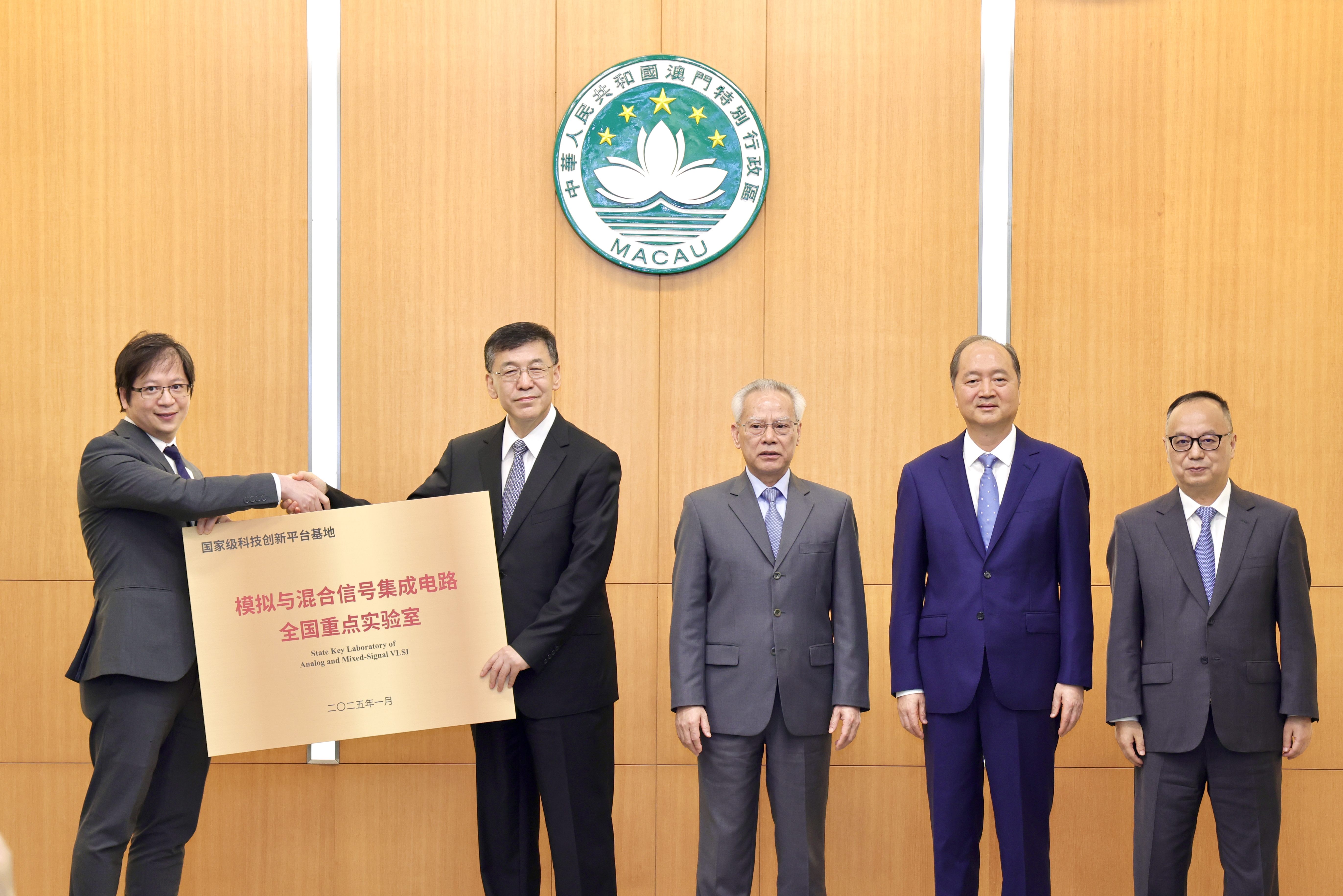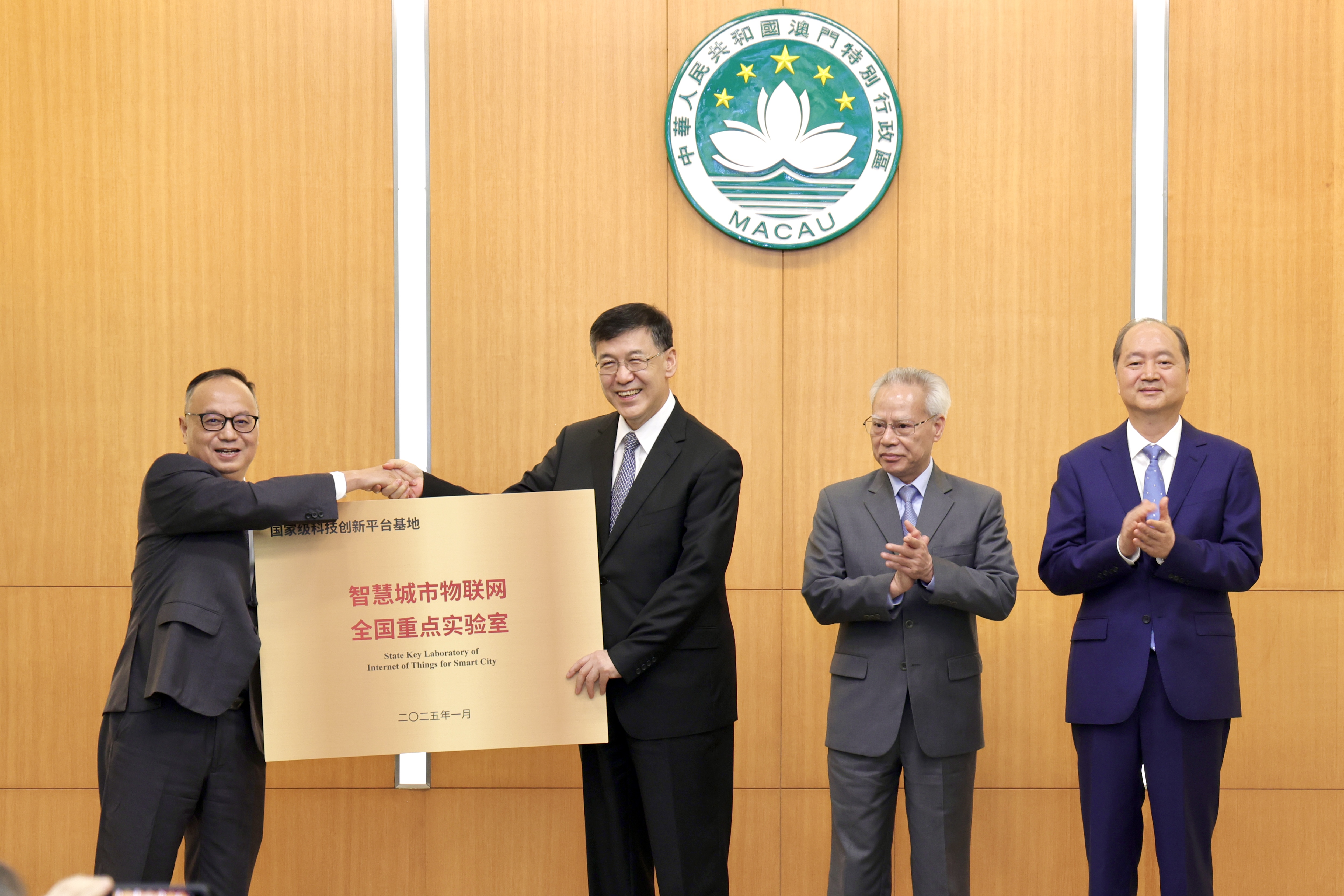 在澳全國重點實驗室授牌儀式下午四時四十五分假政府總部舉行,在行政長官岑浩輝和中聯辦主任鄭新聰見證下,國家科學技術部部長陰和俊分別向“智慧城市物聯網全國重點實驗室”“模擬與混合信號積體電路全國重點實驗室”“中藥機制與品質全國重點實驗室”“月球與行星科學全國重點實驗室”四所實驗室頒授牌匾。外交公署特派員劉顯法,經濟財政司司長戴建業,澳門科學技術發展基金行政委員會主席余雨生,澳門大學校長宋永華、澳門科技大學校長李行偉以及四所在澳全國重點實驗室的主任等出席。