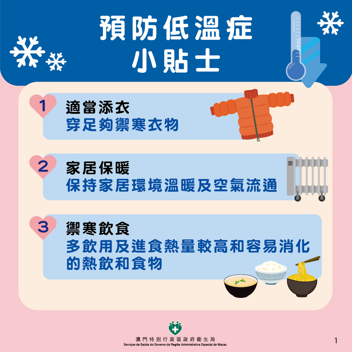 【即時新聞】地球物理氣象局預料,一股冬季季風將於1月1日當日稍後時間抵達華南沿岸,屆時氣溫將顯著下降,1月3日最低溫 9℃,下週初持續寒冷。衛生局特此呼籲居民預防低溫症,注重禦寒保暖。尤其是長者、慢性病患者,以及負責照護他們的人士和機構,務必採取適當的預防和照護措施,切實保障其健康。