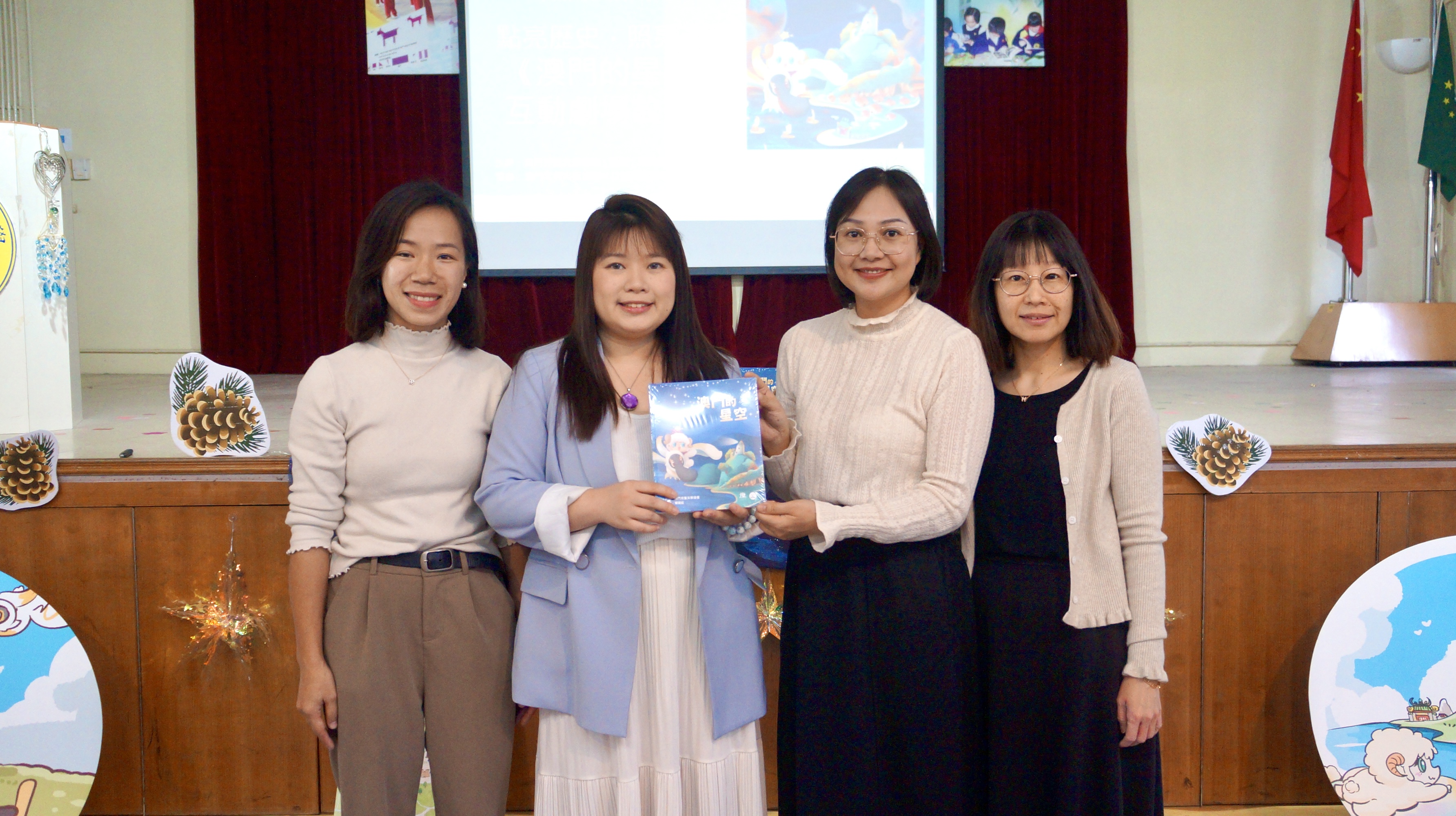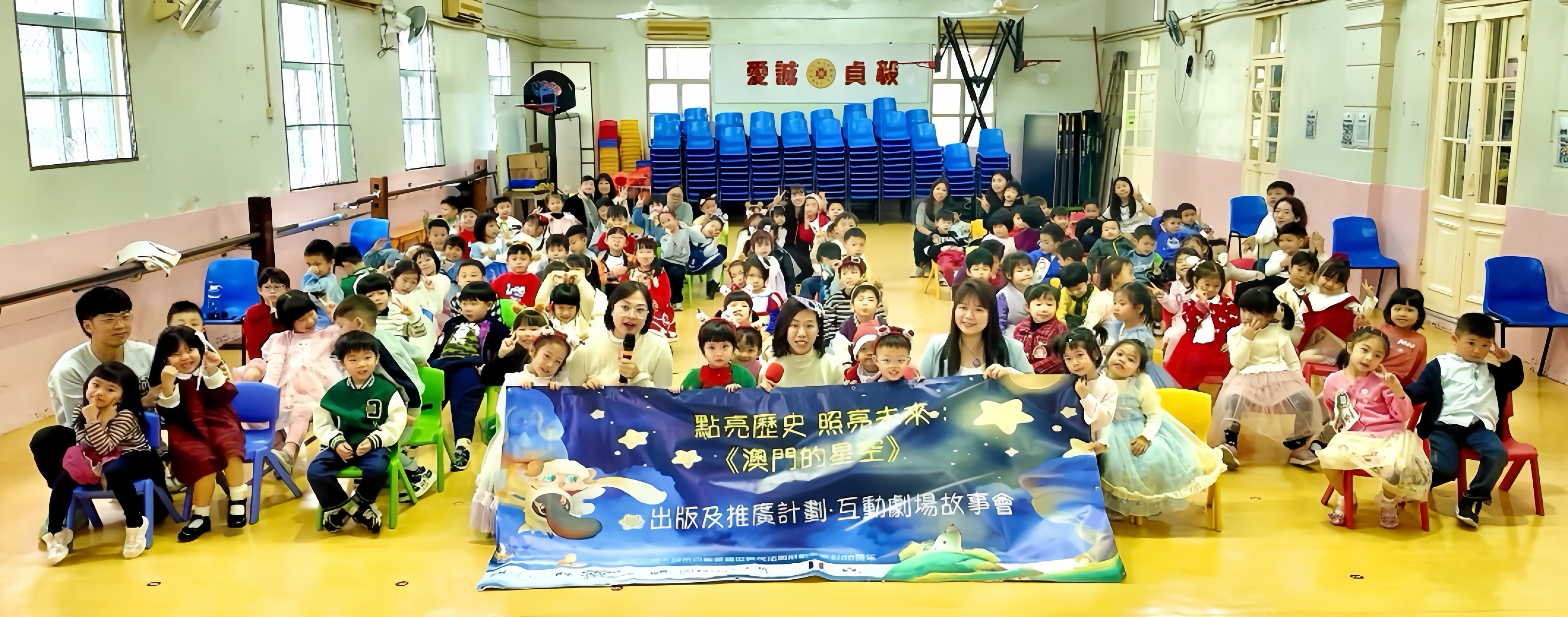 《澳門的星空》匯聚九位本地兒童文學作家,包括羊豬老師、土皮、羅樂、望風、蕭雅雯、向天屏、彭執中、陳康妮與譚健鍬,按三個年齡段創作九篇故事,以文學手法呈現抗戰時期澳門的歷史面貌。作為延伸活動,由戴碧筠老師策劃的「互動劇場故事會」改編自書中《咩噢的星光》,以沉浸式戲劇走進校園與社區,自十月起已演出超過十三場,廣受好評。