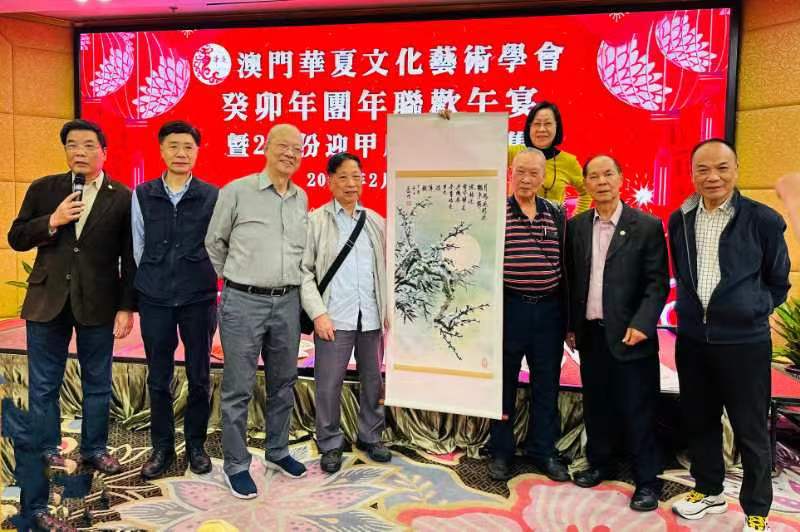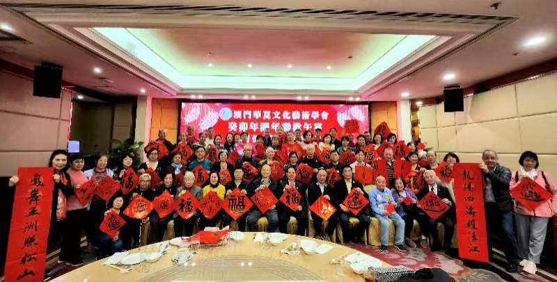 【即時新聞】澳門華夏文化藝術學會於今日中午假萬豪軒舉行癸卯團年迎新歲雅集,該會會長關權昌,副會長阮毓明、周永騰、林德昌,監事長李汝榮、副監事長陳國照,副理事長柯燕等近60多位理監事及會員出席,席間會員積極書寫揮春,互送新春祝福,場面氣氛熱烈。