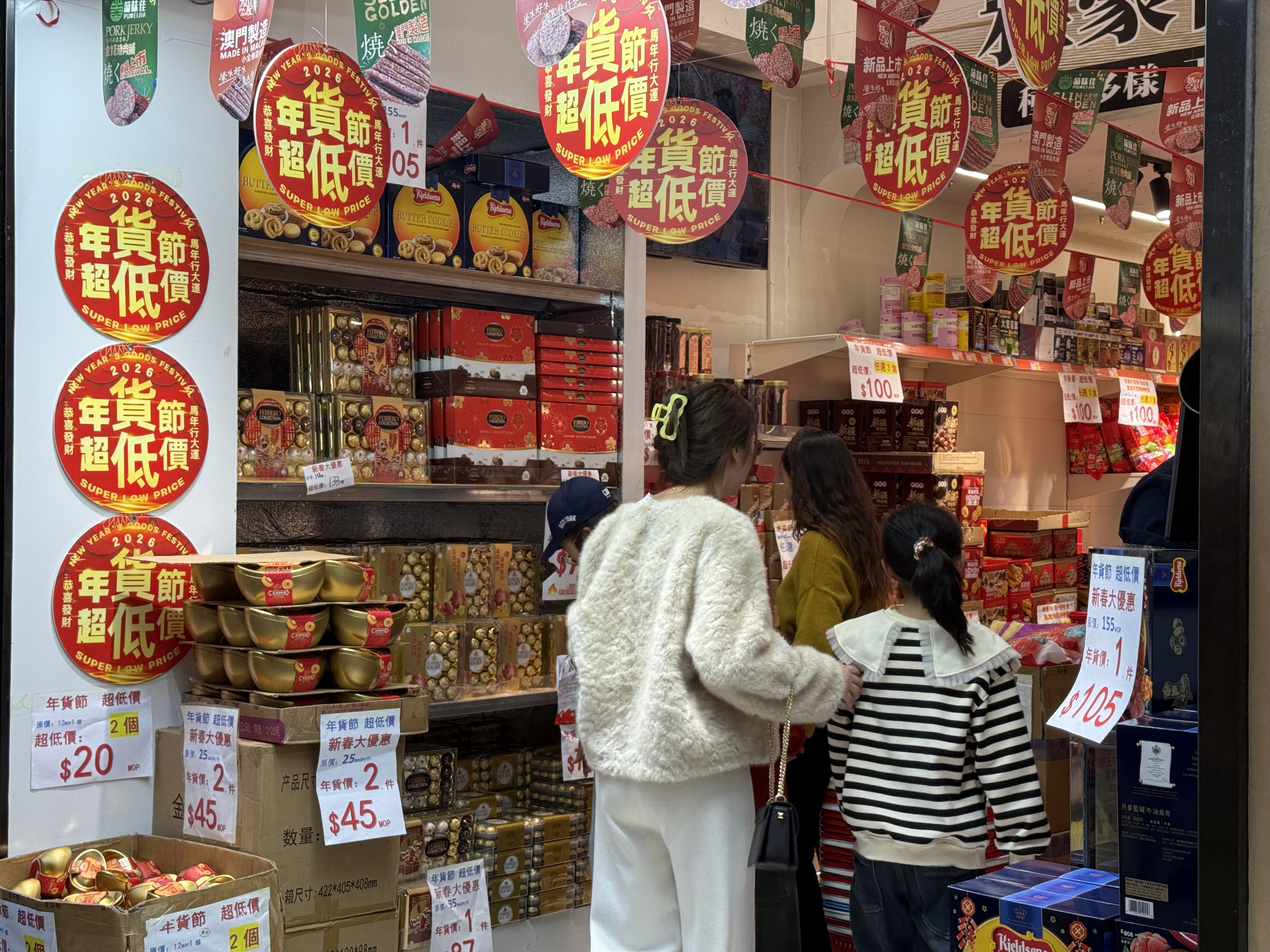 年貨採購熱潮同步升溫,部分商舖紛紛裝點紅色彩帶,推出新春折扣活動,零售店人頭湧湧,朱古力、餅乾等年貨放置在最顯眼位置供旅客挑選。手信店門前排起長隊,亦有雪糕開新店推出優惠活動吸引大批旅客排隊購買。有來自珠海的陳小姐表示,周末來澳觀看演唱會,順便來新馬路一帶「打卡」拍照,認為澳門的春節氛圍濃厚,燈光佈置精緻又有特色,每一處都值得拍照留念。