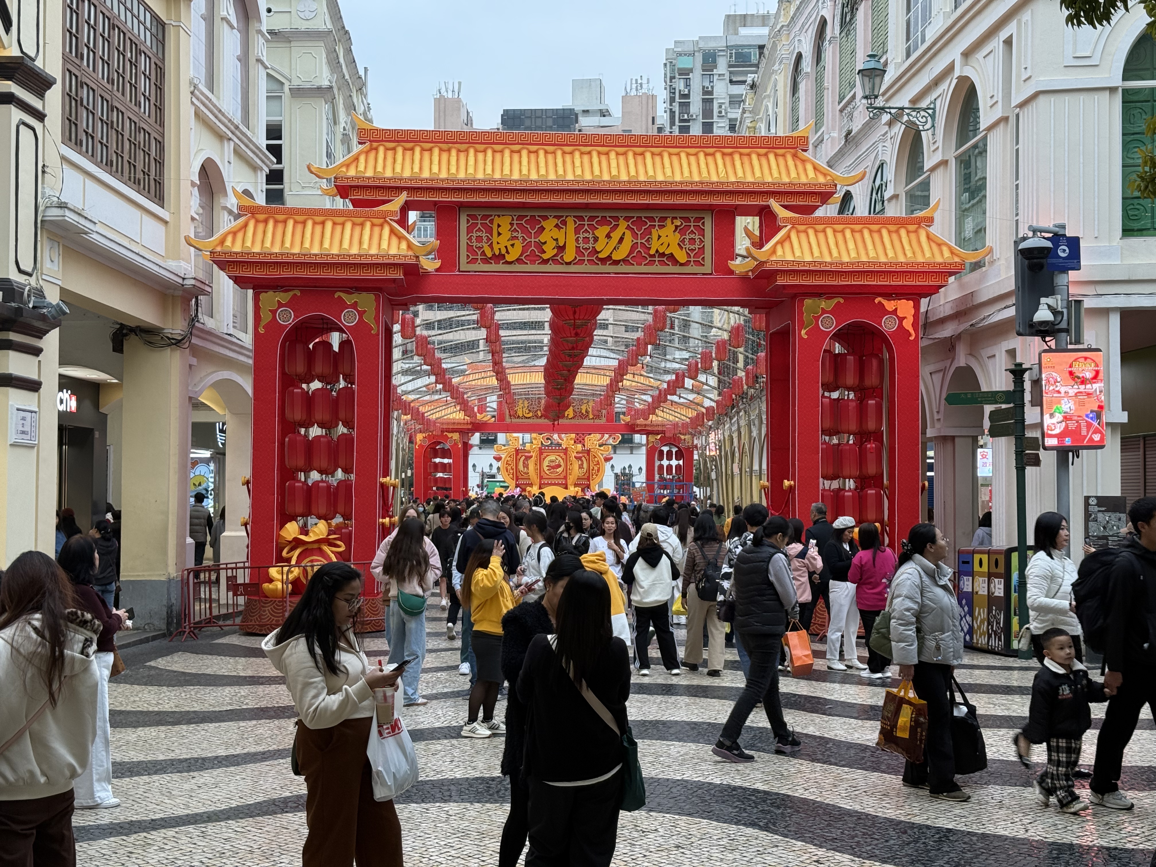議事亭前地的新春主題裝置已陸續安裝完成,馬年主題大型燈飾與傳統宮燈交相輝映,成為遊客打卡的熱門地標。沿途可見舉著相機、手機的遊客們定格美好瞬間,歡聲笑語縈繞街巷,為佳節增添了鮮活氣息。