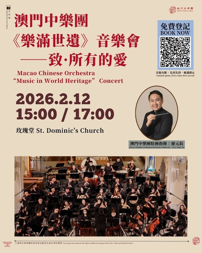 為與市民大眾喜迎新春佳節,文化局將獻上一系列熱鬧歡樂的文娛活動,並走進社區,展現中華優秀傳統文化。文化局將於2月12日下午3時及5時在玫瑰堂上演《樂滿世遺》,由澳門中樂團帶來多首洋溢節日氣氛的音樂佳作,藉歷史建築與音樂藝術融合的演出,為節日增添美好回憶。文化局澳門演藝學院音樂學校將於2月14日在澳門演藝學院禮堂呈獻《迎春音樂會2026》,以獨奏、重奏等多種形式演繹多首中西音樂作品,門票於2月9日起在一戶通進行登記,先到先得。