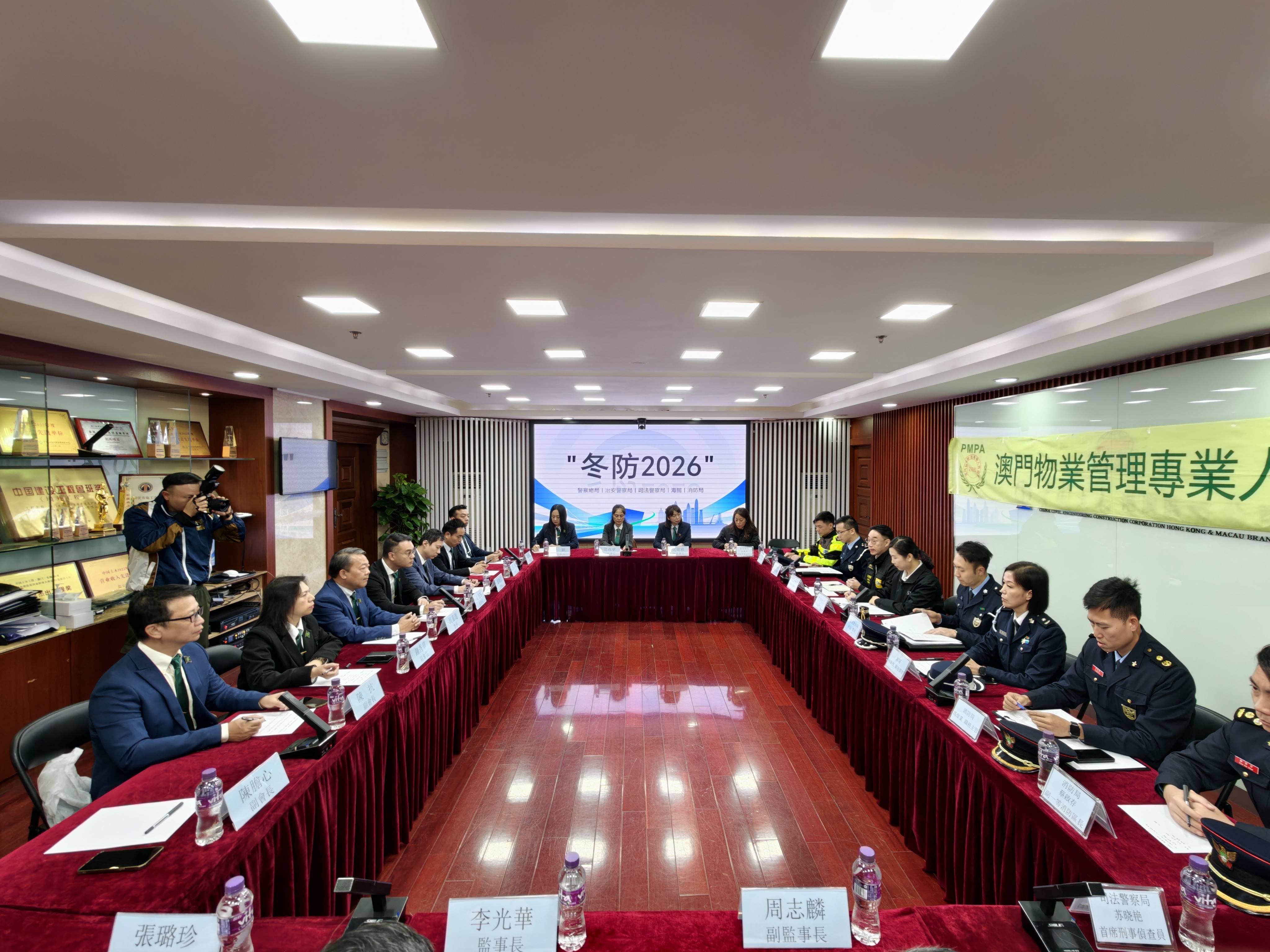 【即時新聞】為加強新春期間的社區安全宣傳,攜手社會各界共建平安祥和的節日氛圍,保安範疇轄下五個部隊及部門組成聯合代表團,由警察總局副警司李嘉儀、澳門海關關務督察何佩甄、治安警察局警司林強、司法警察局職務主管林振輝及消防局職務主管馮偉業等領導帶隊,一行約十五人於2月3日拜訪澳門物業管理專業人員協會。由協會會長周嘉進率領一眾副會長及理監事成員參與接待,雙方就多項社區安全議題進行交流,並共同開展冬防宣傳活動,向公眾傳遞防罪、防火、防騙等重要安全訊息。同時雙方深入探討了多項與社區及大廈管理相關的安全議題並交換意見。