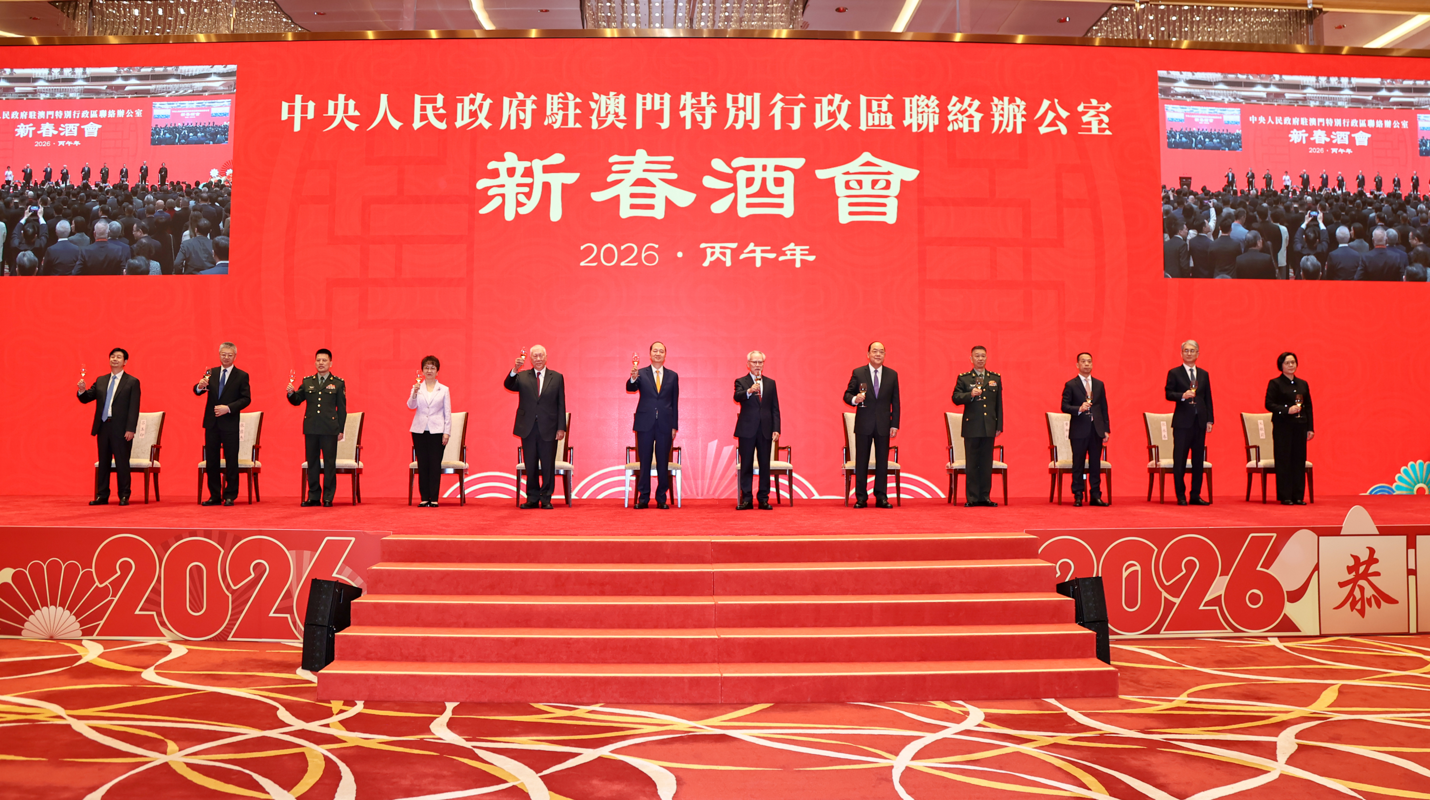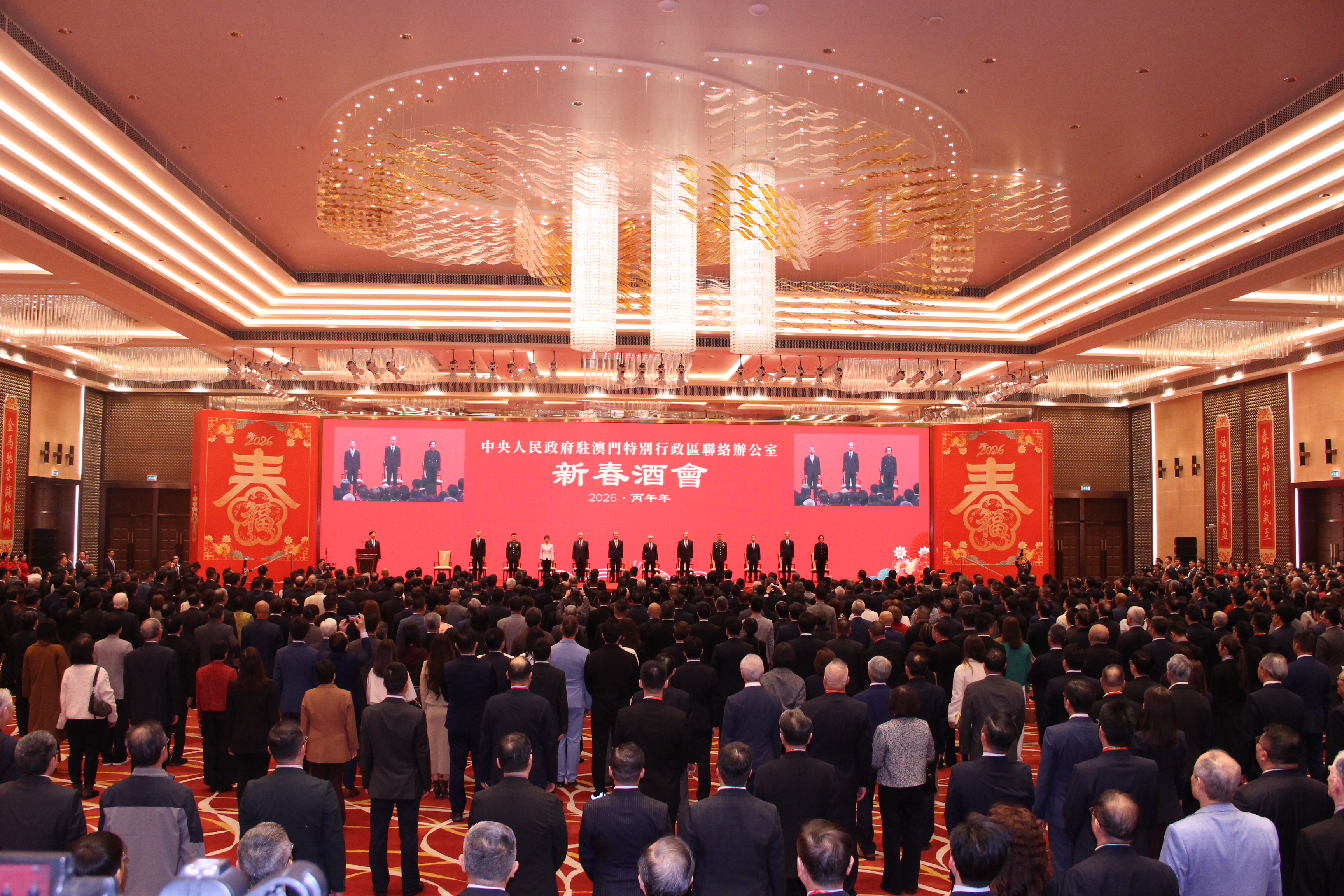 【即時新聞】中央政府駐澳門聯絡辦公室下午3時30分假中葡平台綜合體舉行舉辦2026年新春酒會。受中央港澳辦主任、國務院港澳辦主任夏寶龍委託,中央港澳辦副主任、國務院港澳辦副主任,中央政府駐澳門聯絡辦公室主任鄭新聰代表夏寶龍主任、中央港澳辦、國務院港澳辦和中央政府駐澳門聯絡辦公室向廣大澳門居民致以新春祝福。澳門特別行政區行政長官岑浩輝出席並致辭,全國政協副主席何厚鏵,前行政長官賀一誠,外交部駐澳門特派員公署特派員卞立新,解放軍駐澳門部隊司令員于長江、政委林慶華,中央政府駐澳門聯絡辦公室副主任黃柳權、呂玉印、張應傑,以及特別行政區立法、司法機構主要負責人,特別行政區政府主要官員,澳區全國人大代表、全國政協委員,特別行政區行政會委員、立法會議員,以及澳門社會各界代表人士約1300人出席酒會。