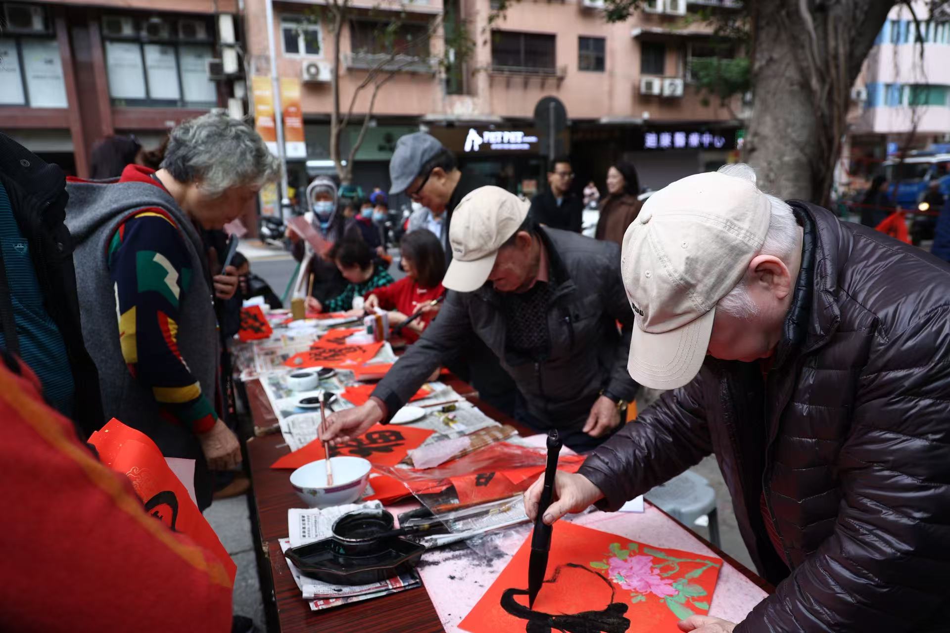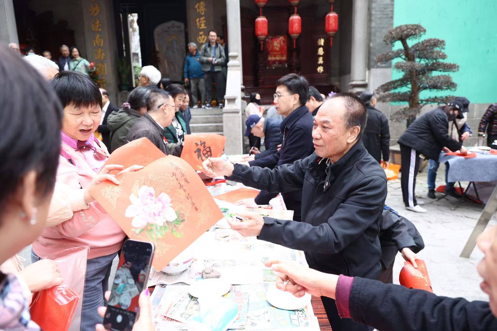 【即時新聞】由澳門書法院、南國紅豆藝苑及澳門普濟禪院聯合主辦的“駿馬迎新歲 揮春送百福”活動,今日下午二時半假普濟禪院(觀音堂)門口舉行,邀請多名本澳書畫界人士參加,為街坊書寫揮春、馬字、福字及對聯等,喜迎馬年。