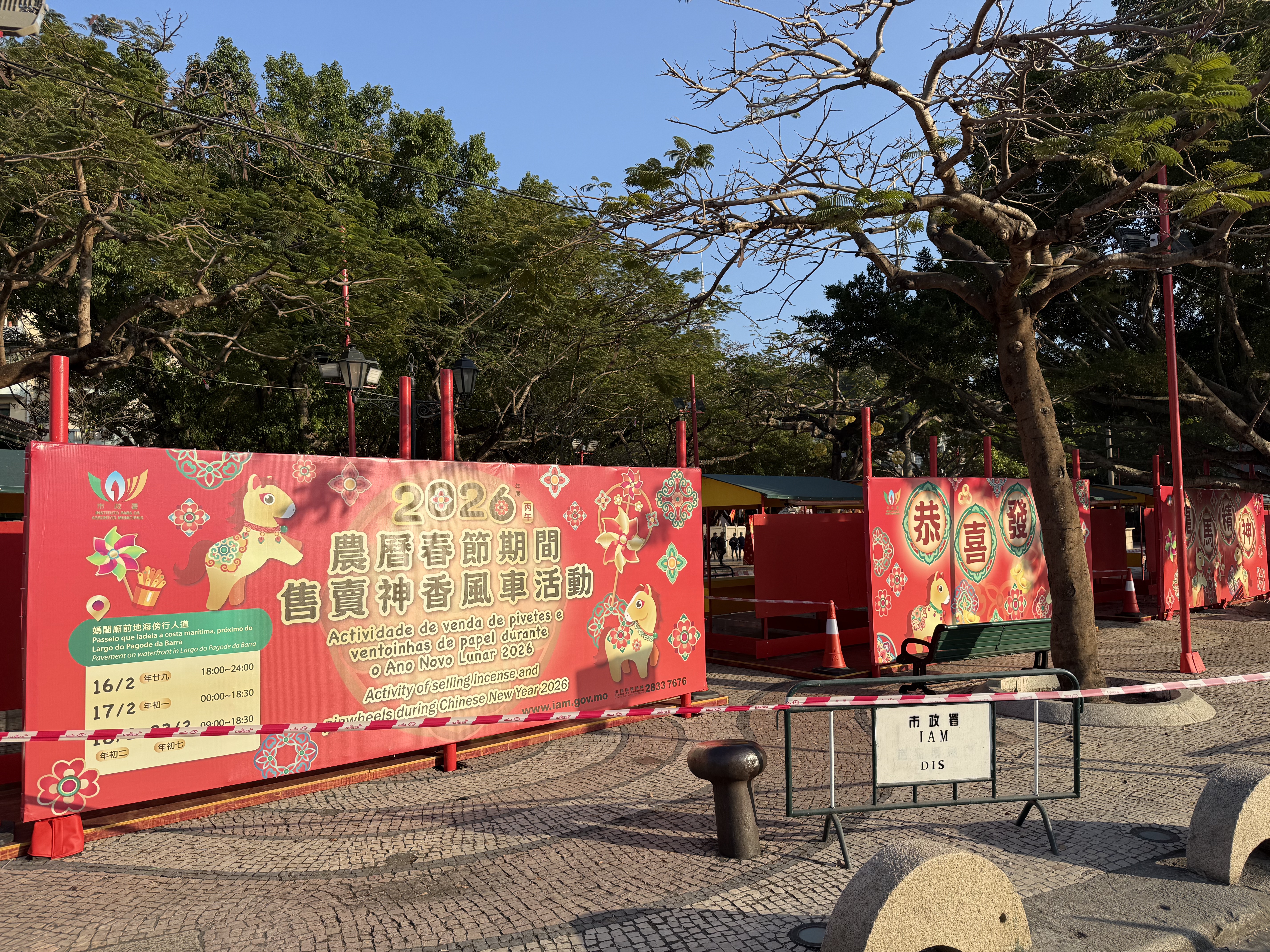 【即時新聞】爆竹燃放區及售賣神香風車攤檔明日開放。其中,媽閣廟前地海傍行人道設立十個售賣神香、風車的臨時攤檔,營業時間為明日傍晚六時至晚上十二時、2月17日(年初一)凌晨零時至傍晚六時三十分、2月18日至2月23日(年初二至年初七)早上九時至傍晚六時三十分。現場所見,媽閣廟前地放置指示牌,標註售賣及燃放爆竹、煙花區域,現場攤位已準備就緒,紅色警戒線隔開攤檔,靜候明日攤檔開放。