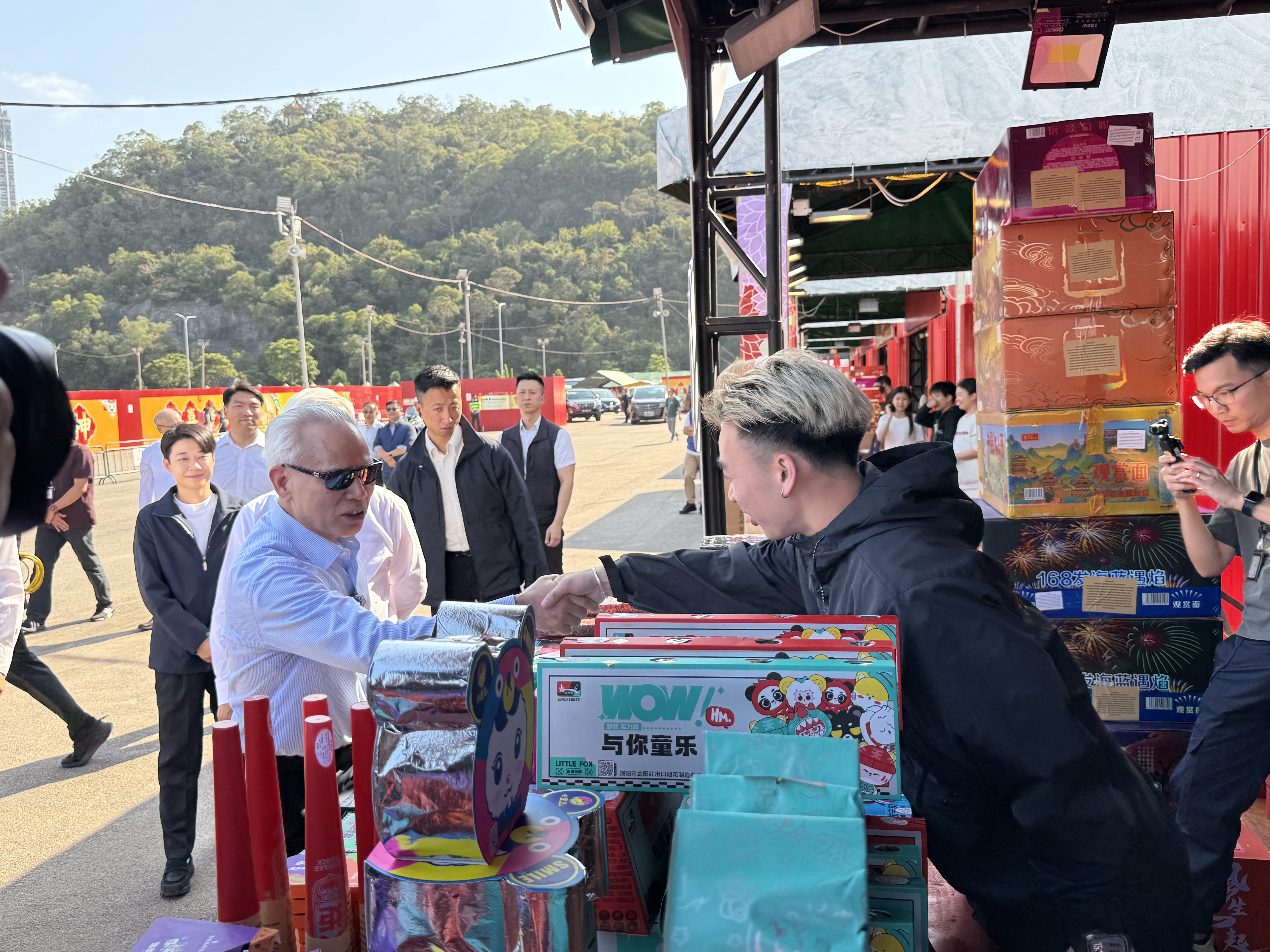 【即時新聞】行政長官岑浩輝於今日下午約三時半到氹仔爆竹燃放區,了解爆竹燃放區的攤檔經營情況,向各檔主及在場工作人員致以節日問候,期間還燃放爆竹及煙花,祝願澳門及廣大居民馬年大吉。