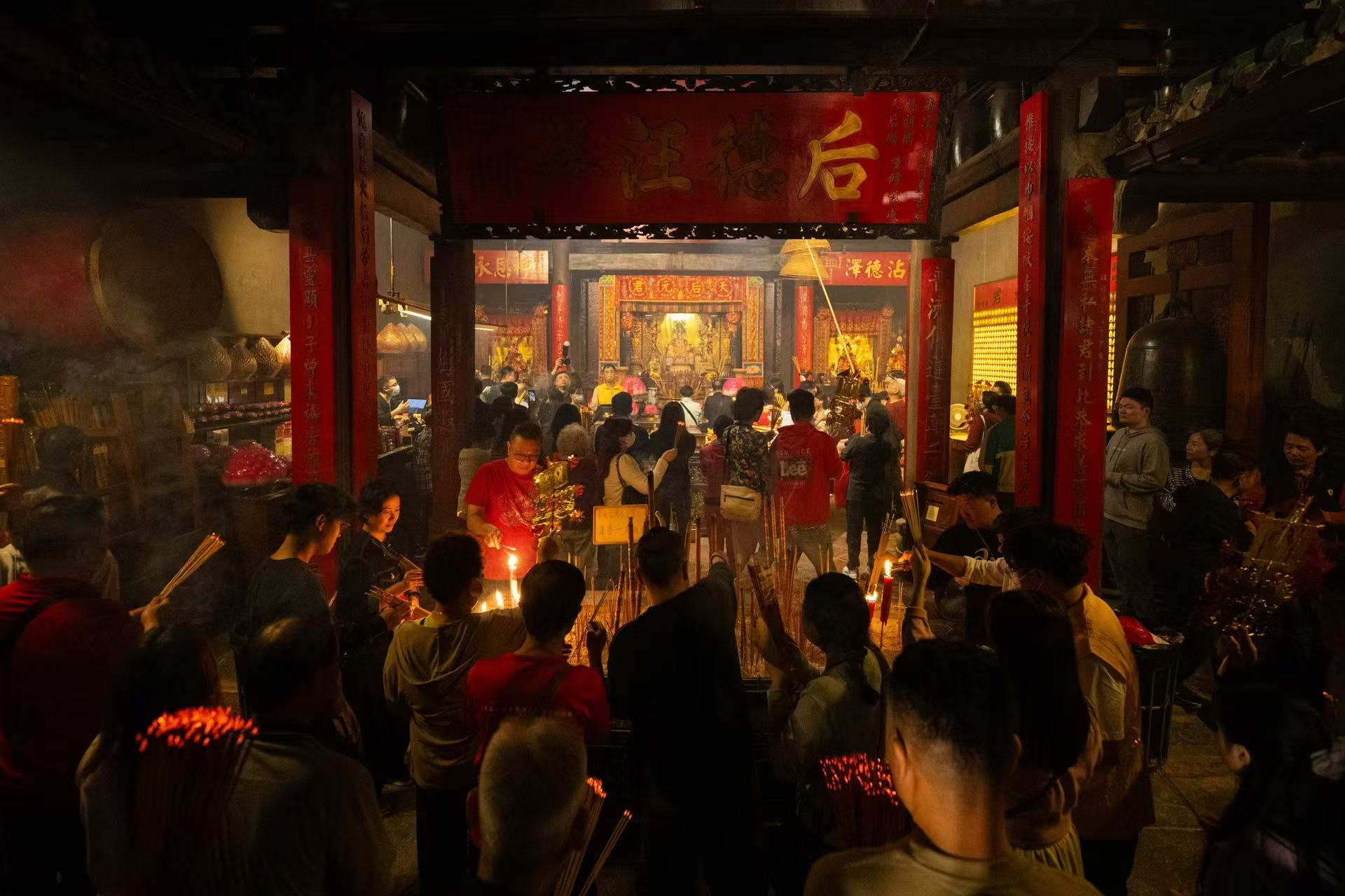 媽閣廟在除夕晚上十時開放居民善信入內上頭炷香,警方在廟門口前地擺放鐵欄圍成通道,應對人潮高峰時採取潮水式放行,以維持秩序。