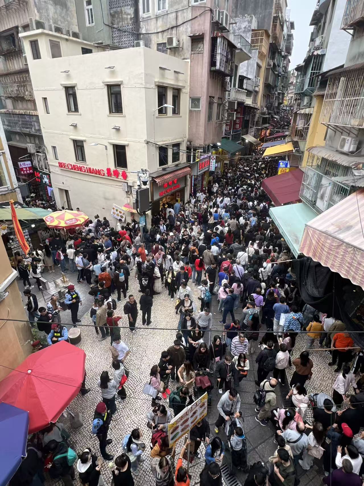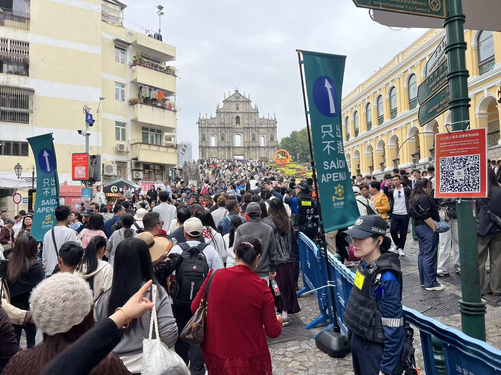 【即時新聞】治安警察局於15時20分實施人潮管制:大三巴街行人只可單向上行前往牌坊,並取道周邊的街巷如大關斜巷、關前後街、高園街等離開。
