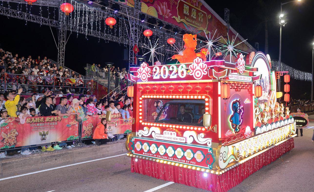 【即時新聞】由旅遊局主辦、亞洲旅遊交流中心、市政署、經濟及科技發展局(下稱“經科局”)、招商投資促進局(下稱“招商局”)、文化局、體育局和橫琴粵澳深度合作區經濟發展局(下稱“合作區經發局”)協辦的“駿馬騰飛 歡樂春節 2026農曆新年花車匯演”於今(2月19日)晚在西灣湖廣場隆重開幕。配合首辦的“金駿雲翔 歡樂春節”無人機煙花匯演,以及“歡樂春節─2026年龍騰舞躍賀新春”社區巡演,三項活動已獲國家文化和旅遊部納入“歡樂春節”活動框架,共同呈現澳門節慶與文旅融合的特色,吸引眾多居民與旅客到場觀賞,現場氣氛熱烈。