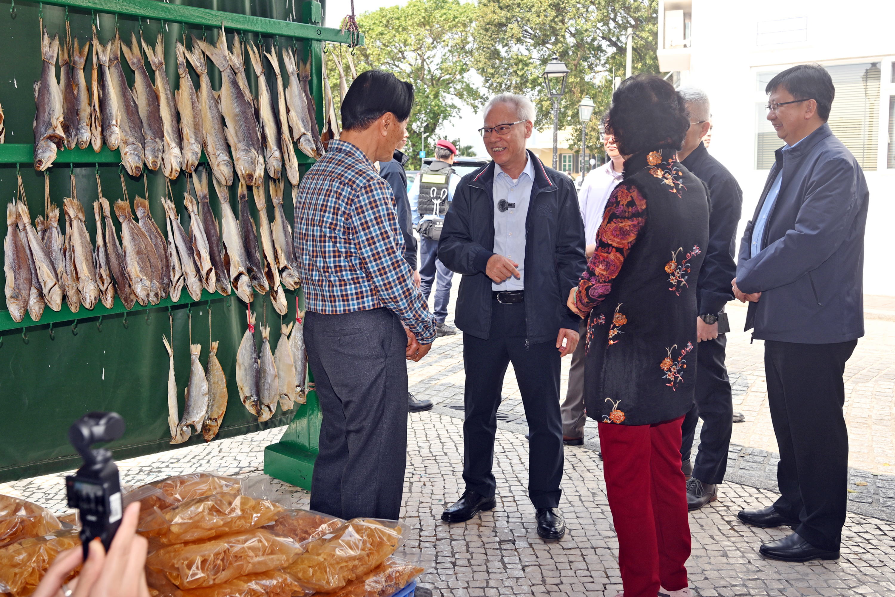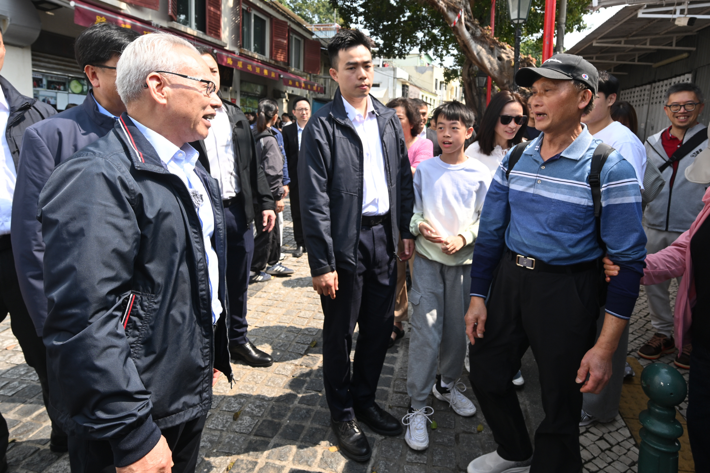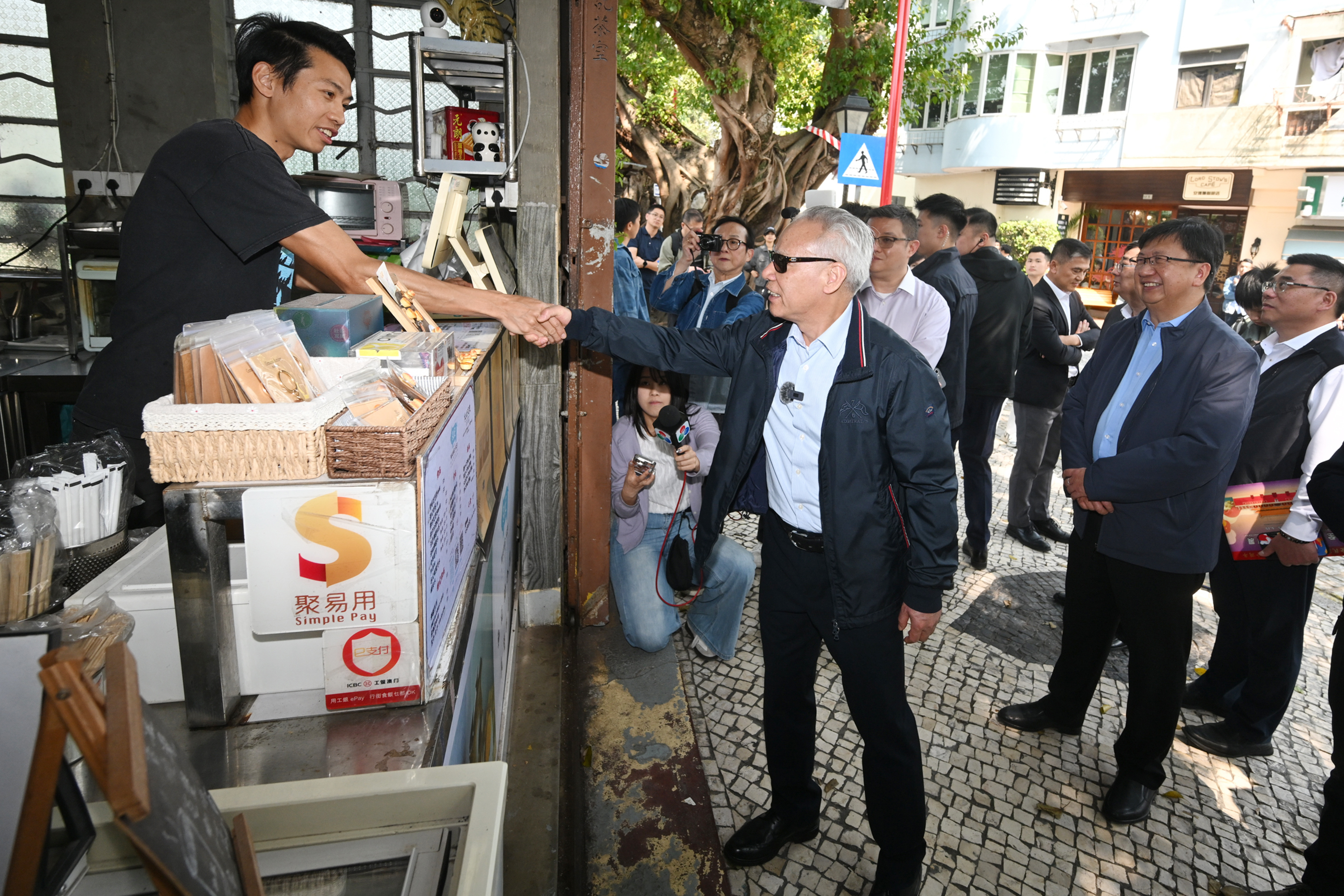岑浩輝隨後轉往氹仔,在行政法務司司長黃少澤陪同下,視察經整治優化後的氹仔街市。他與檔主親切交談,瞭解新環境對日常經營帶來的改善與效益;他又到訪街市內新設的“美食+文創區”,聽取有關推動傳統街市轉型和可持續發展措施的介紹。岑浩輝其後與戴建業探訪氹仔舊城區一帶的商戶,瞭解新春期間和平日的營商狀況。