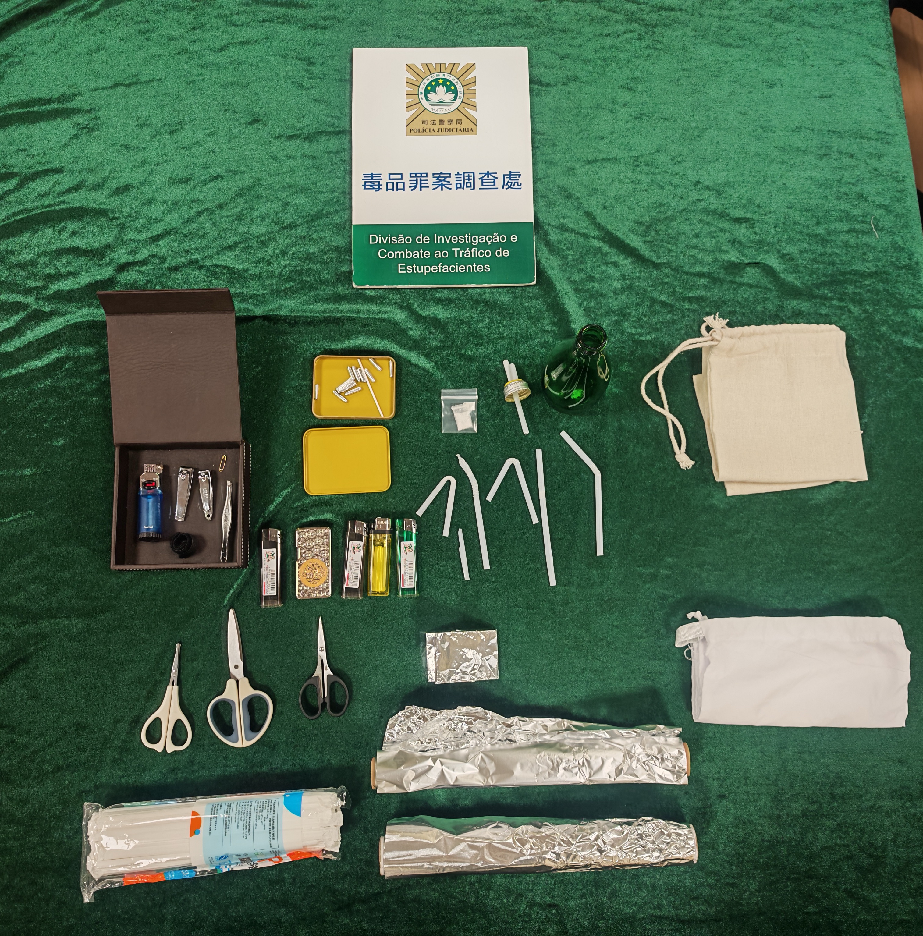事發本周二(17日)下午2時,酒店職員例行查房時見房內藏有吸毒工具,隨即通報酒店負責人及報警。司警接報到場,聯同保安在大堂截獲涉案35歲內地無業男子,並在其租住的房間床上搜出一小包冰毒,以及經改裝的水樽、吸管等吸毒工具。經查,男子經港珠澳大橋口岸自攜毒品入境,惟拒絕透露來源及供應者。