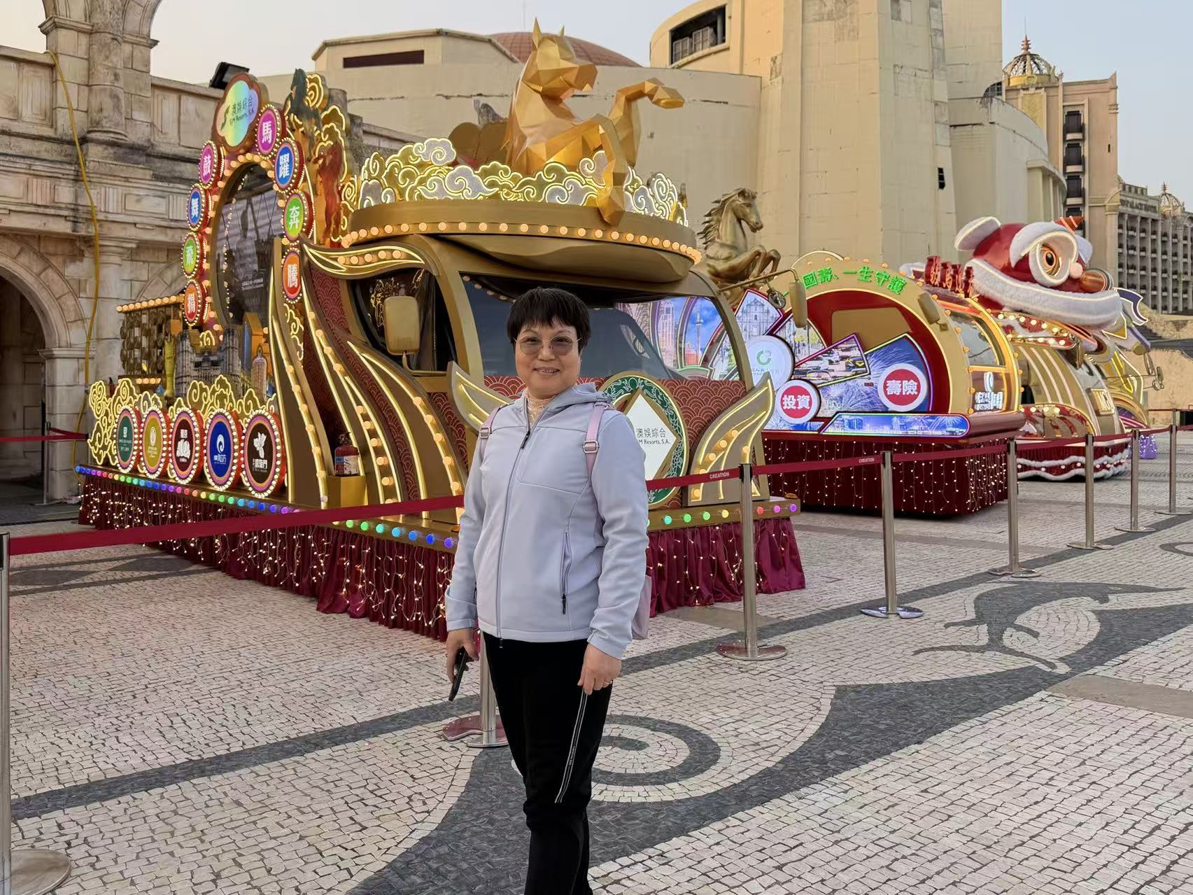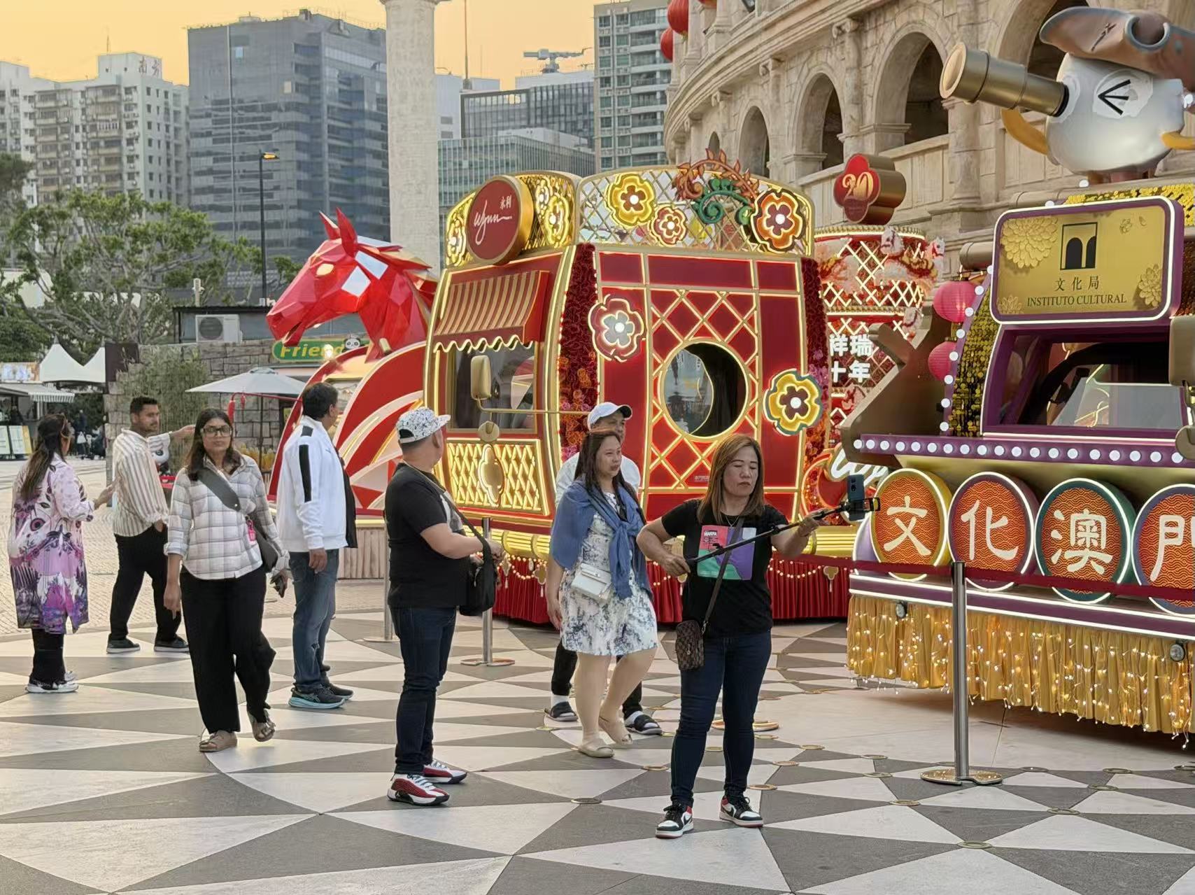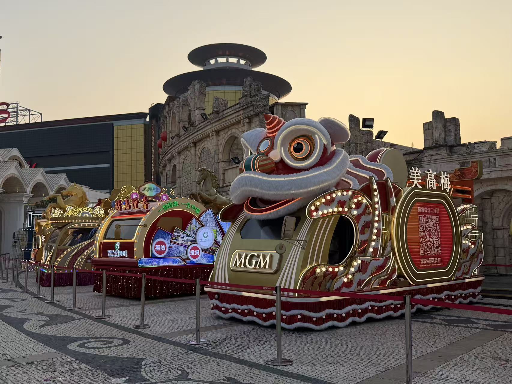 現場花車保持匯演時的佈置,車身可見福字、祥雲、生肖等農曆新年元素,部分花車融入澳門地標及文旅特色設計。下午5時燈飾開啟後,現場人流有所增加,市民鄺女士表示,晚上燈光效果更清晰,便於拍攝留念,此前未能觀看花車匯演,但可以透過展覽近距離欣賞花車也很有意義,展覽選址在漁人碼頭也很合適,地點開闊,適合親子前來參觀,為新年休閒活動提供更多選擇。