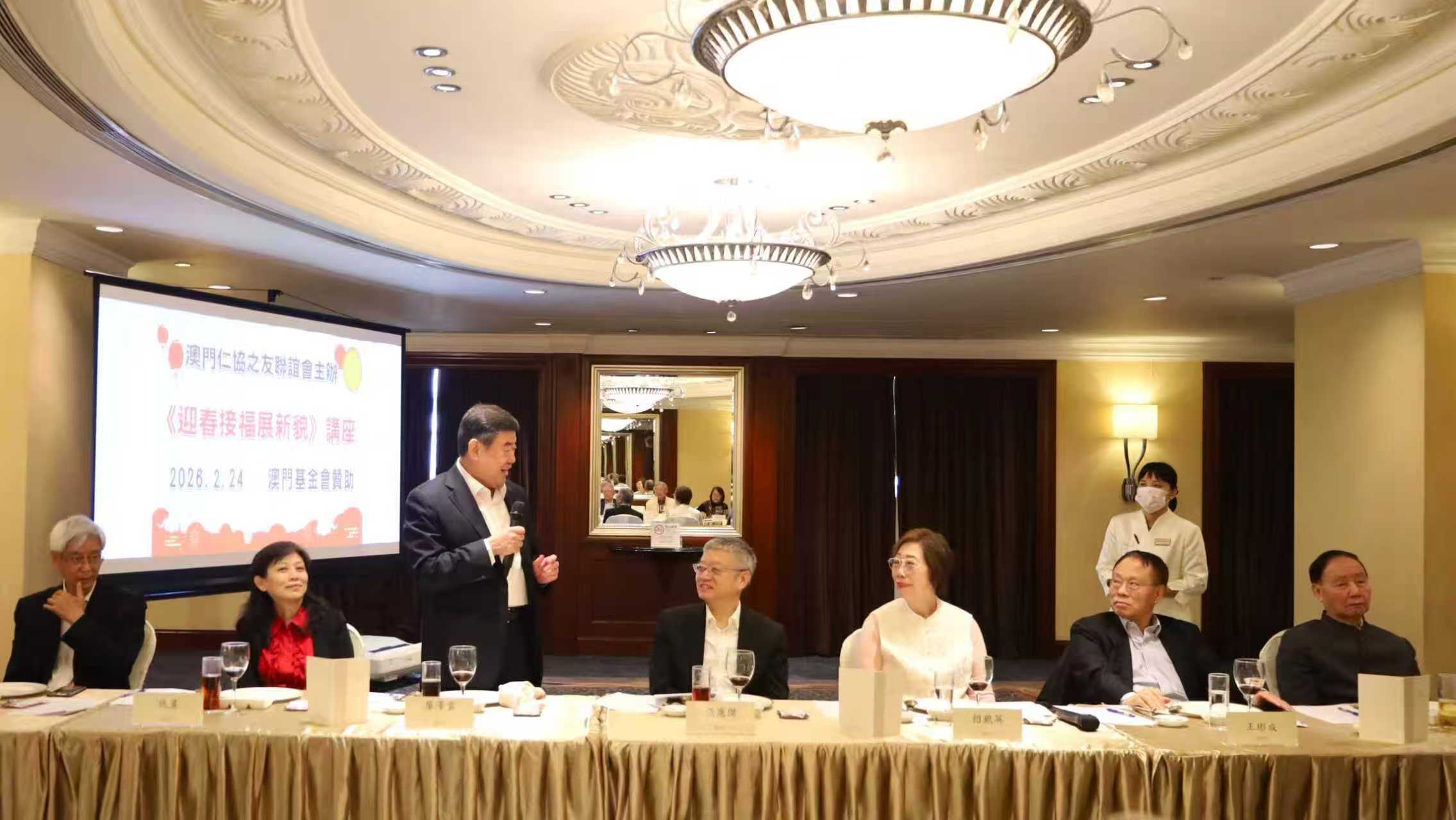 【即時新聞】仁協之友昨日中午假皇都酒店維凱廳舉行「迎春接福展新貌」新春講座,講座由常務副會長梁慶庭主持,理事長招銀英作會務報告,會長廖澤雲就主題進行了發言。中聯辦副主任張應杰、協調部部長仇昱,仁協負責人賀定一、吳仕明、李沛霖、冼為鏗、梁樹森、王彬成、李向玉、林笑雲、孫恩光、梁勵、楊秀雯、尤端陽、吳培娟、姚鴻明、梁玉華、黎世祺、黎振強、陳錦鳴、黃耀榮等出席。講座獲澳門基金會贊助。