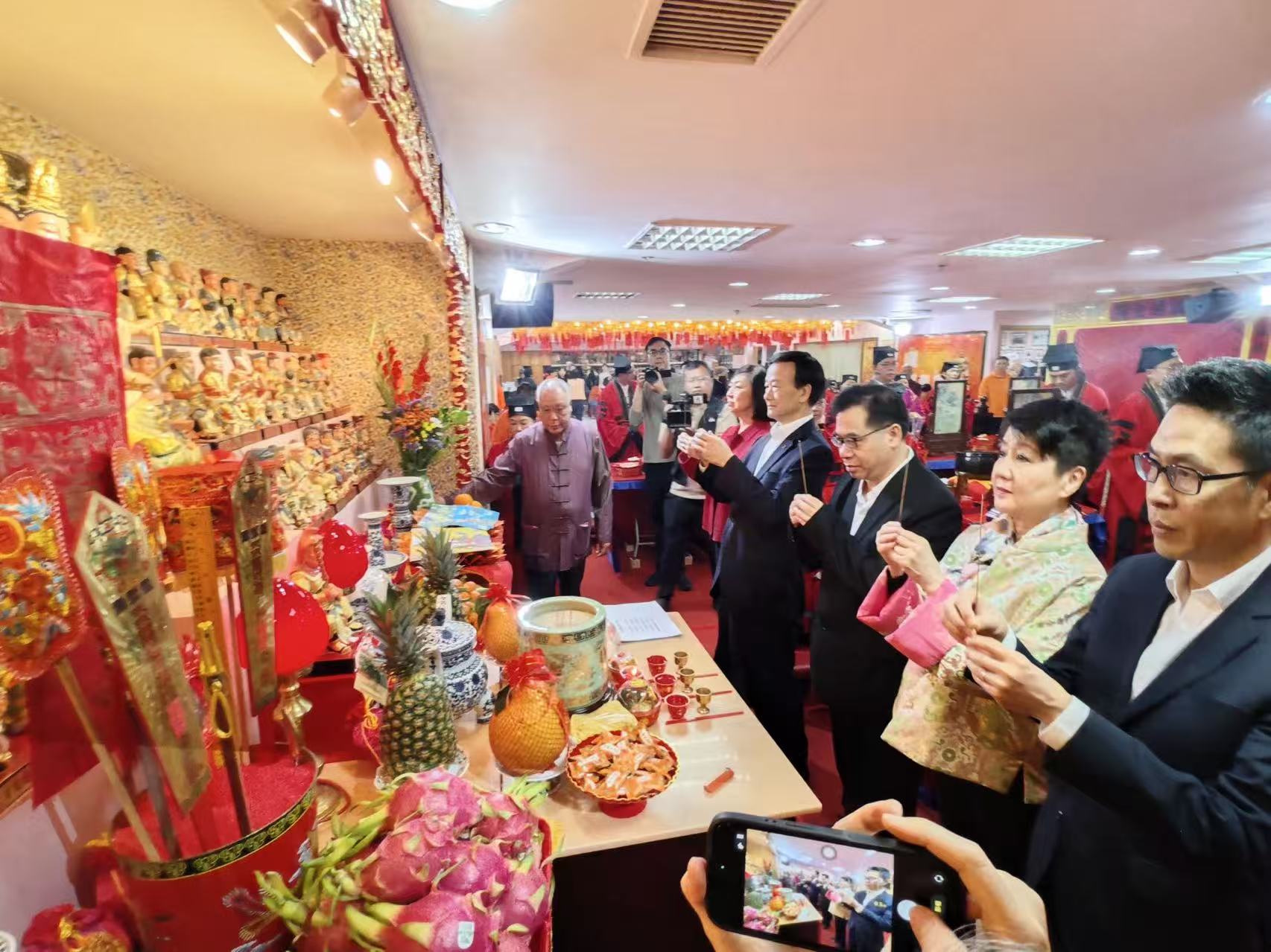 首場法會今日上午十一時假該會會址舉行,澳區全國人大代表、澳門地區中國和平統一促進會會長劉藝良,中聯辦巡視員布志光,澳區全國人大代表蕭志偉,旅遊局副局長程衛東,文化局廳長蘇建明,立法會議員梁安琪,永利澳門有限公司總裁董事會副主席陳志玲等出席,一眾嘉賓逐一上香祈福。