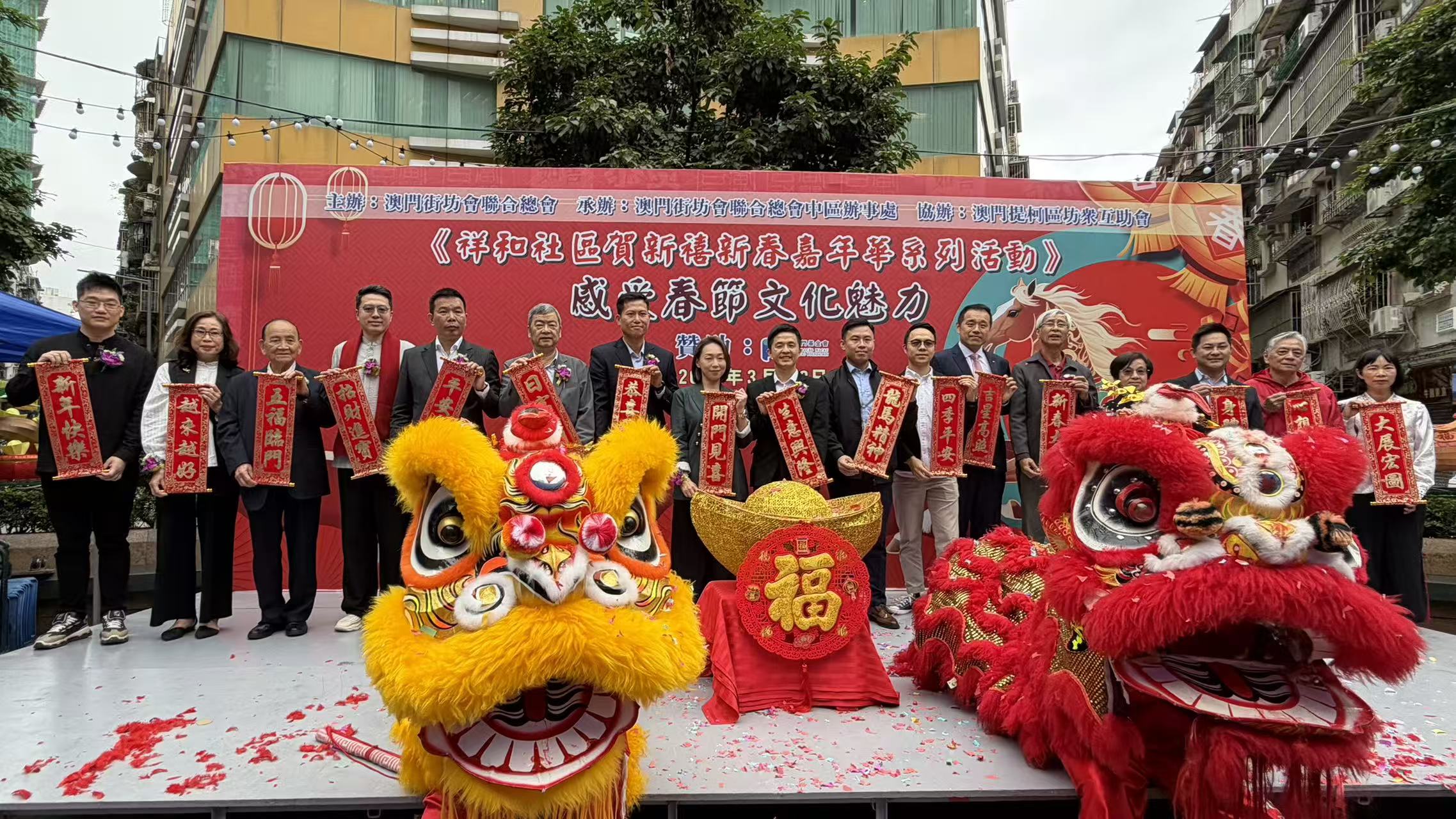 【即時新聞】由澳門街坊總會主辦、街坊總會中區辦事處及提柯坊會承辦的「祥和社區賀新禧新春嘉年華系列活動——感受春節文化魅力」今日上午十一時假三盞燈圓形地舉行開幕儀式。活動於本月一日及三日舉行,設歌舞文藝表演、醒獅巡遊及商戶拜年,與區內居民和旅客共慶新春佳節,冀增強三盞燈社區經濟活力,促進社區經濟發展,同時活躍區內春節氣氛。