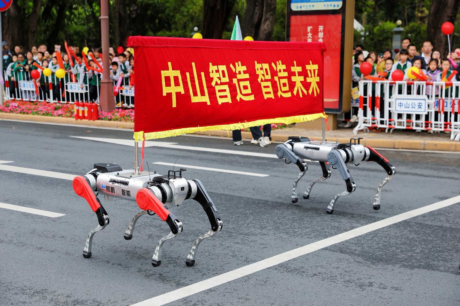 產業科技創新方隊成為巡遊現場一道科技感十足的風景線。中山本土企業製造的足式機器人、醫療配送機器人、情感陪伴機器人、無人掃地車、智慧輪椅機器人等智慧裝備集中登場,硬核彰顯中山科技創新實力與“智造”優勢。
