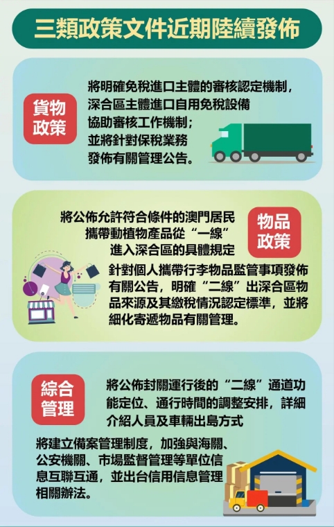 按照《總體方案》,橫琴與澳門之間設為“一線”;橫琴與中華人民共和國關境內其他地區之間設為“二線”。日前,財政部、海關總署、稅務總局等發佈了有關政策,明確深合區實施“一線”放開、“二線”管住的稅收政策。貨物方面,除另有規定外,符合條件的貨物經“一線”進入深合區免稅,其他情形予以保稅;“二線”進入內地按規定徵收進口稅收;符合條件的可享受加工增值免關稅。物品方面,個人行李和寄遞物品經“一線”進入深合區,以自用、合理數量為限且符合有關規定予以免稅,“二線”進入內地參照自澳門進入內地的進境物品適用的有關規定監管、徵稅。海關根據稅收政策實施監管。依據通告,相關政策自封關運行之日起施行。
