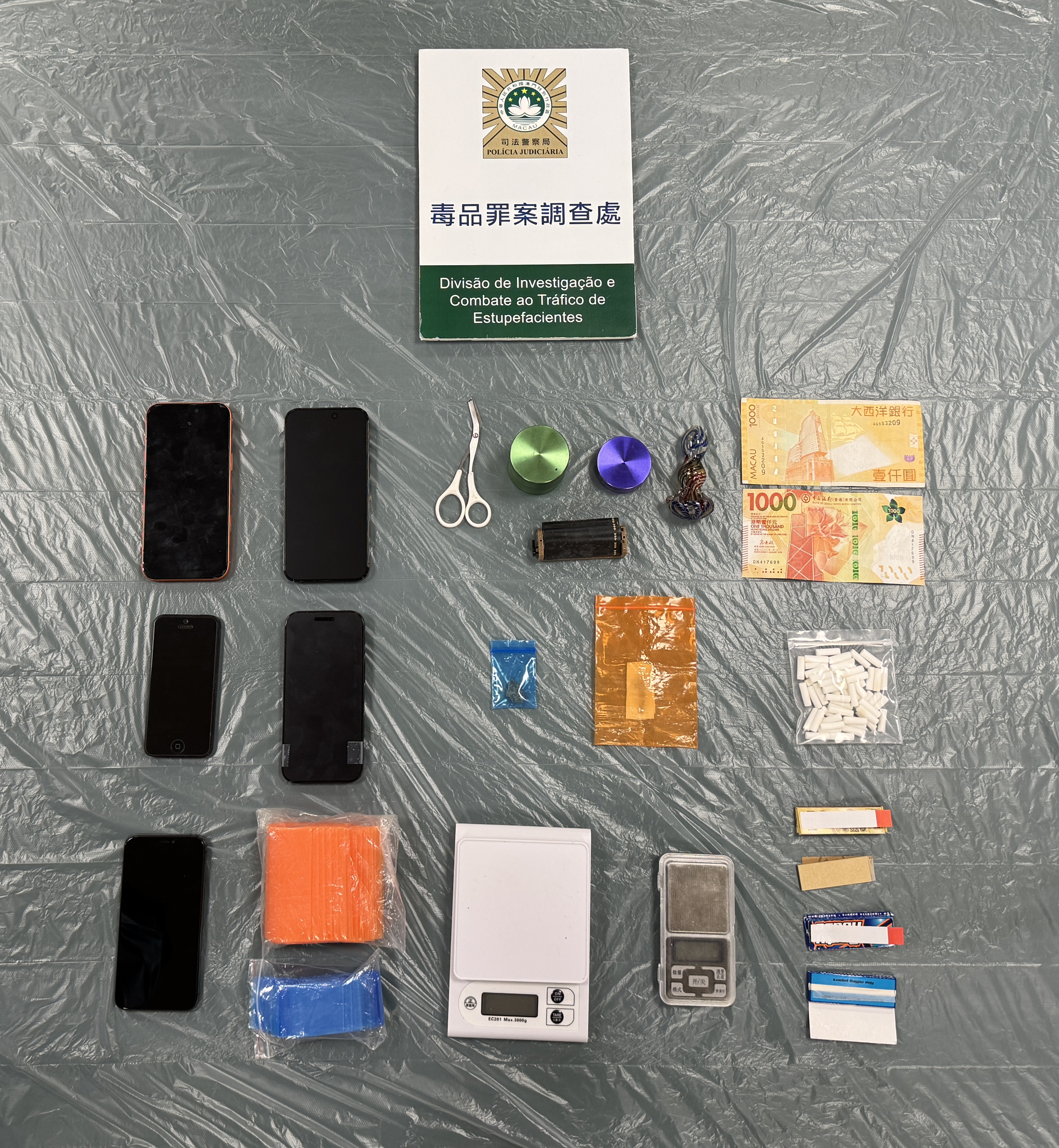警方在馮某位於北區的住所內檢獲一小包共重2.33克大麻花,以及吸毒和分拆包裝工具;在何某停泊在北區某處的電單車頭盔箱內,檢獲一小包共重0.75克大麻花,其後在何某北區住所再檢獲電子磅及100個全新透明膠袋,另檢獲1,000澳門元及1,000港元懷疑毒資。經化驗證實所有植物樣本均為大麻毒品,兩人尿檢均呈陽性。司警正追查毒品來源及兩人是否合謀販毒。