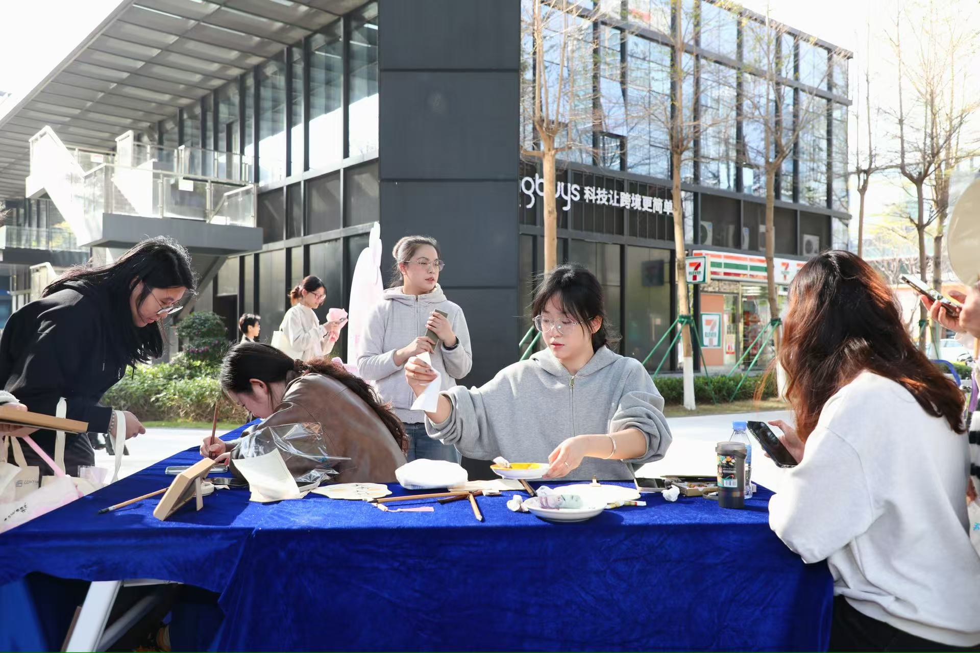 “她芳華·展國風”攤位佈置了簡約的國風擺台和書簽畫,參與者可以用毛筆自由創作,寫寫畫畫,帶走一份屬於自己的作品。“她風采·展魅力”區域設置網紅拍照背景板,提供鮮花、氣球等道具,大家拍照打卡,分享社區女性風采。