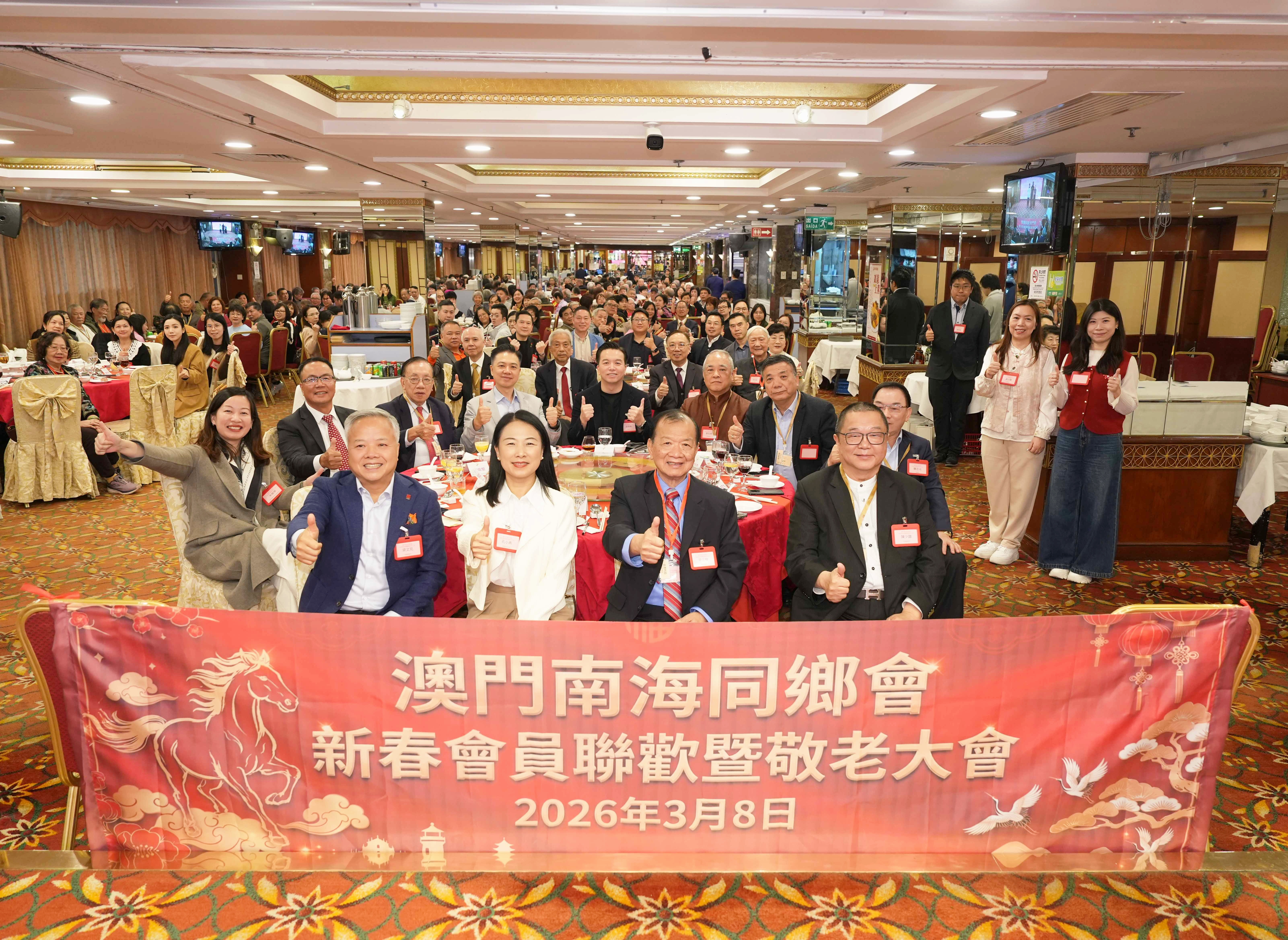 【即時新聞】澳門南海同鄉會於3月8日假座嘉年華酒樓舉行2026年新春聯歡暨敬老大會,延開40多席,招待約四百多位長者及會員歡聚一堂,南海區委常委孔小燕、南海區委統戰部常務副部長朱敏華及一眾嘉賓友好應邀出席,共賀新春,場面熱鬧非凡。