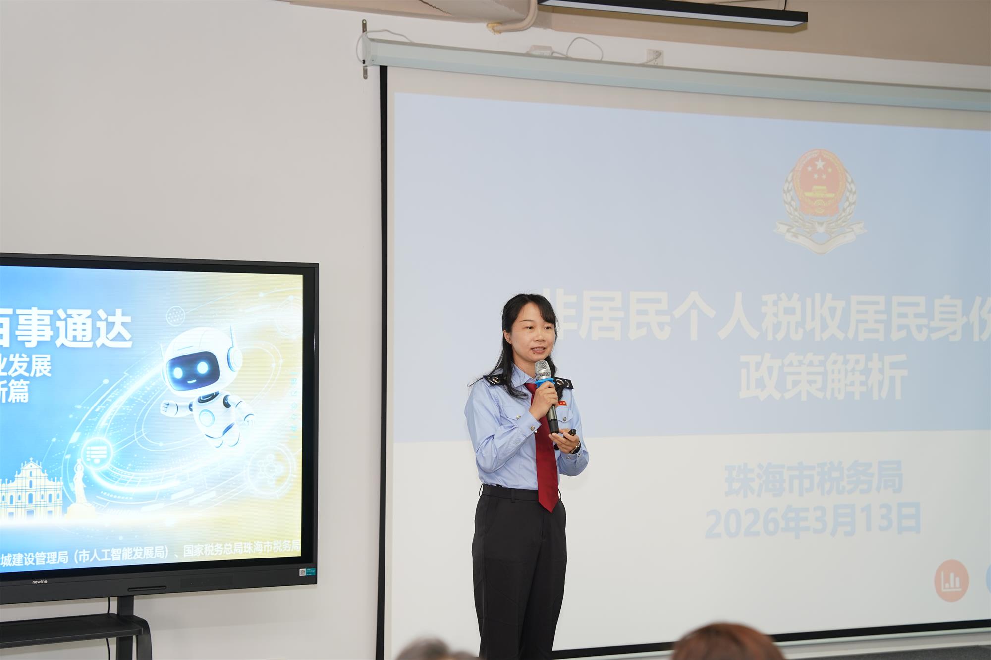 活動現場,珠海市雲上智城建設管理局(市人工智能發展局)圍繞人工智能發展政策要點進行了系統介紹,結合當前人工智能發展趨勢,對相關政策內容和應用方向作了深入講解,幫助與會代表進一步瞭解人工智能領域政策導向,把握產業發展機遇。國家稅務總局珠海市稅務局則圍繞非居民個人稅收居民身份認定政策進行專題解析,就相關政策規定、適用情形和實際操作中的重點問題進行了細緻說明,為港澳青年和有關企業準確理解涉稅政策、提升辦稅便利度提供了有力指導。